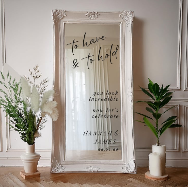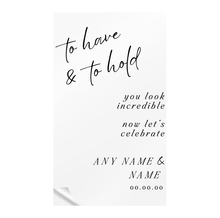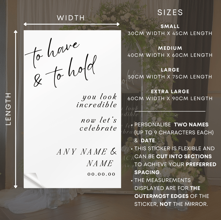Celebrate your special day with a beautifully crafted personalised wedding mirror or signboard sticker featuring the timeless quote "To Have and To Hold." This elegant decal is the perfect touch for your wedding decor, whether displayed on a mirror, signboard, or any other smooth surface.