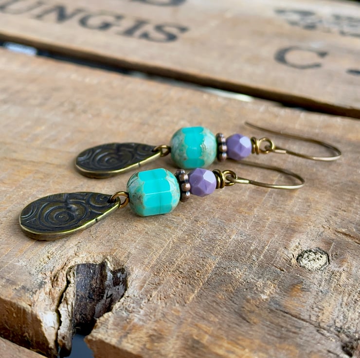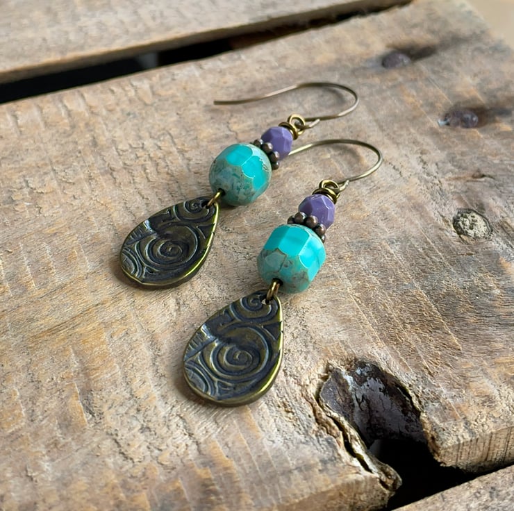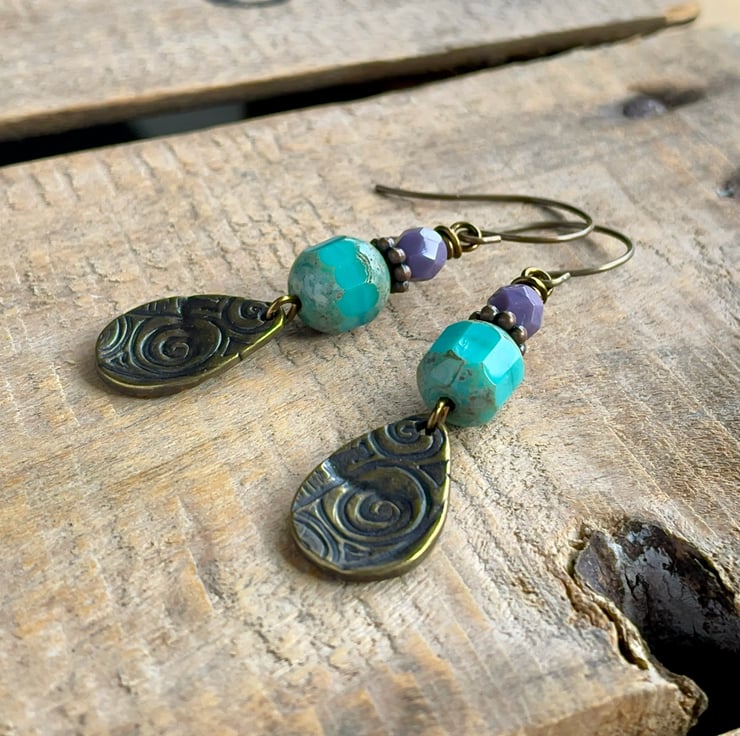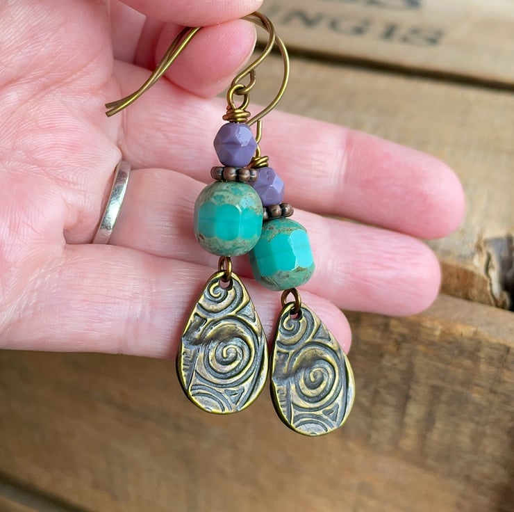 The earrings are finished with small teardrop-shaped oxidised brass charms by Tierracast, featuring a raised swirling texture on both sides.