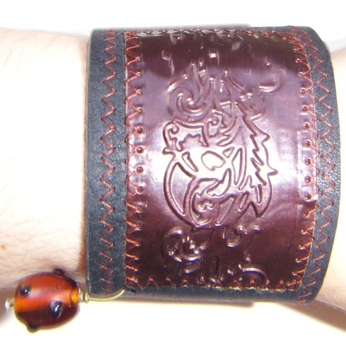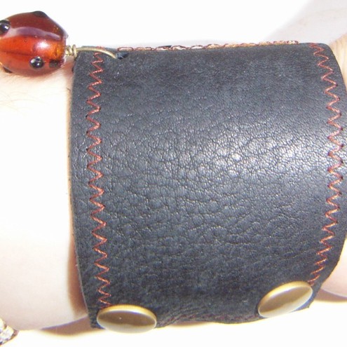 Wristlet made from black recycled leather, with embossed and stitched brown aluminium swirly embellishment, and pretty bead dangle. Raw stitched edge and fastened with gold professional plastic poppers.
