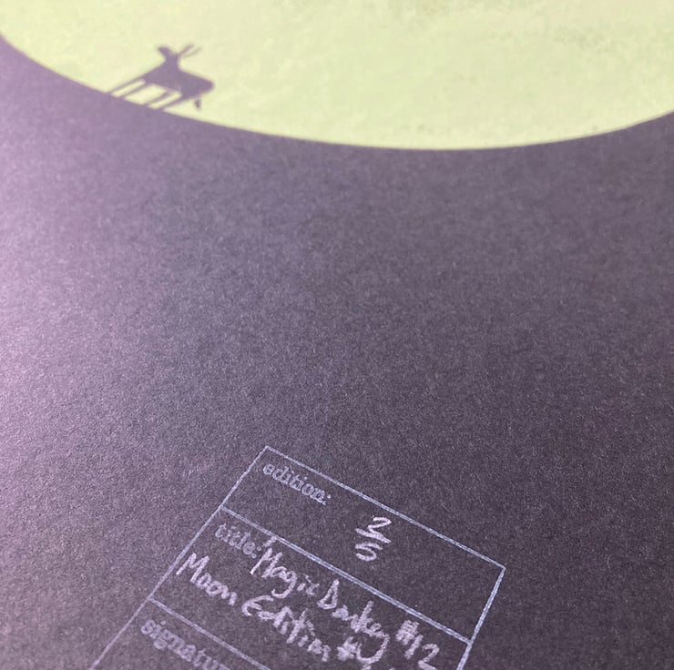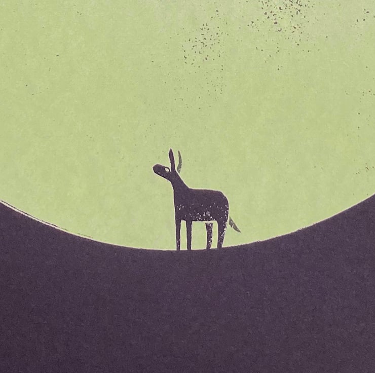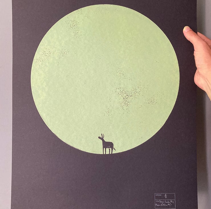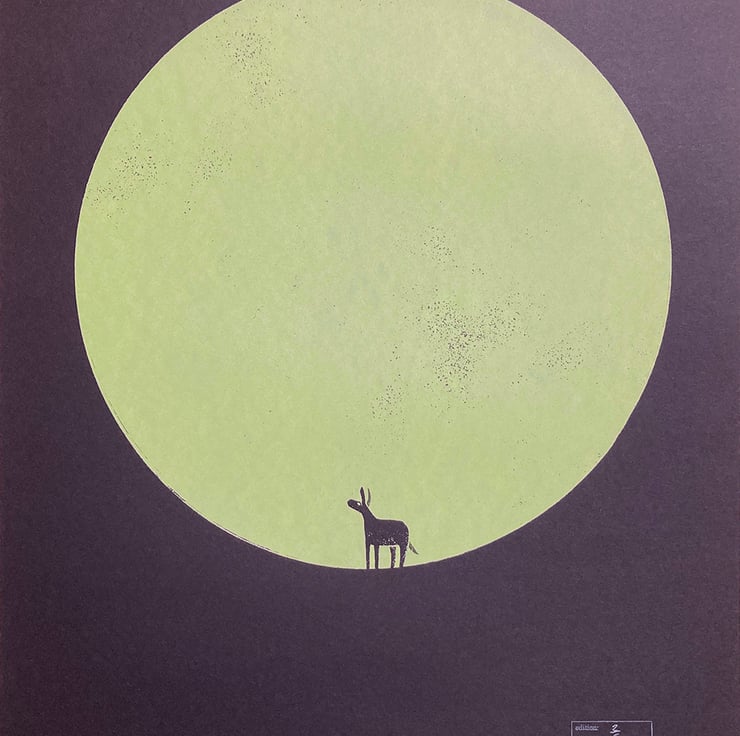 This is the twelfth print in the 'magic donkey' series, a continuation of my donkey dreamworld theme. I've always had a fascination with circles, using them in my prints regularly, and on this occasion it is the ultimate minimalist tribute! The donkey stands before a mighty circle. Is it a moon, a solid dot, a passage to another place? They will find out soon enough..