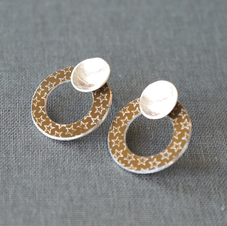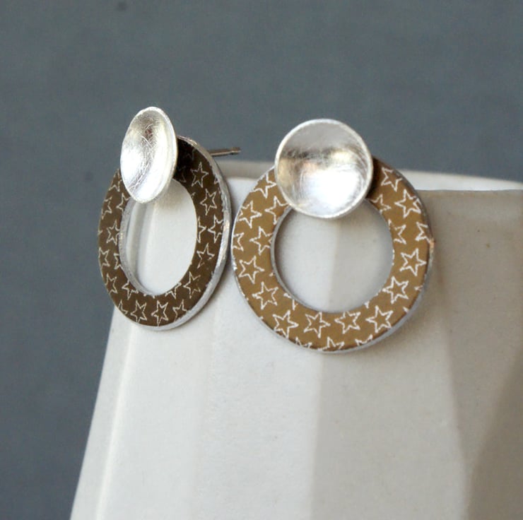 A cute pair of earrings to brighten up your day. The coloured parts are hand cut from anodised aluminium which features my star pattern and has been hand dyed. They have a separate sterling silver domed disc stud which have a satin finish. These can be worn with the circle or on their own.