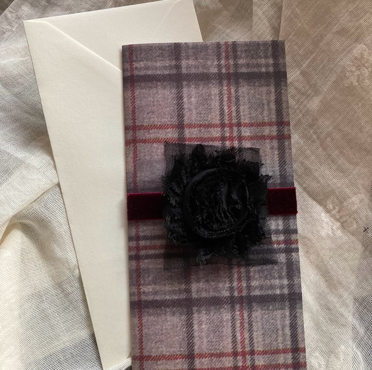 The tartan card at the front has a wine coloured velvet ribbon across the middle with a large black flower on black net in centre position.