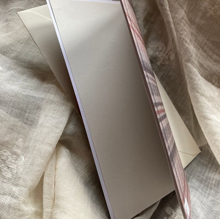 This is a handmade tartan card suitable for many occasions. The tartan is wine and different shades of grey.and the inside of the card is white. The insert and envelope are ivory