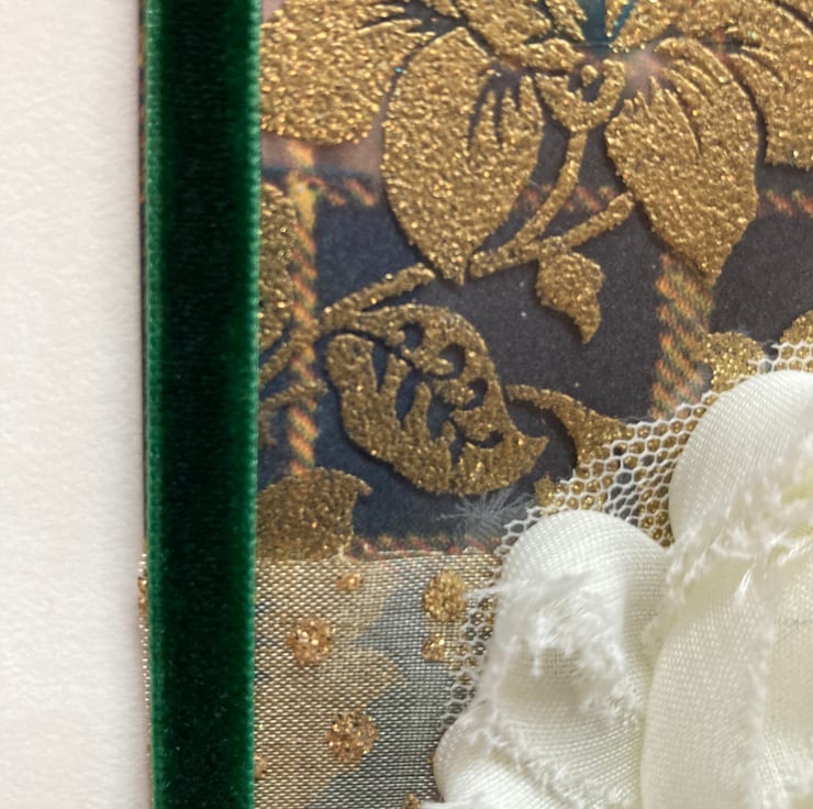 The tartan card at the front has a gold patterned piece with a gold spotted sparkly ribbon and a large ivory flower in centre position.