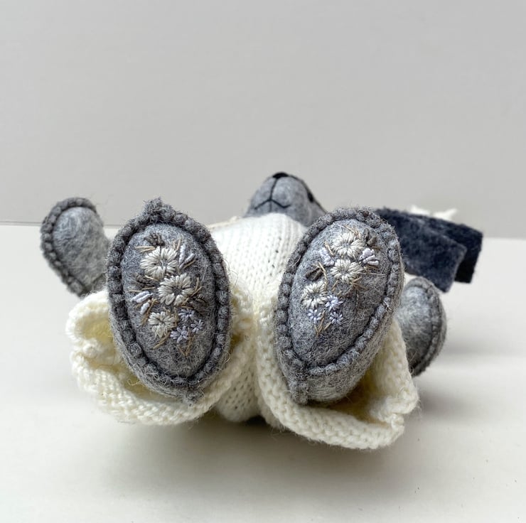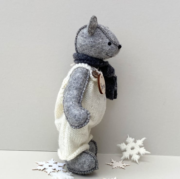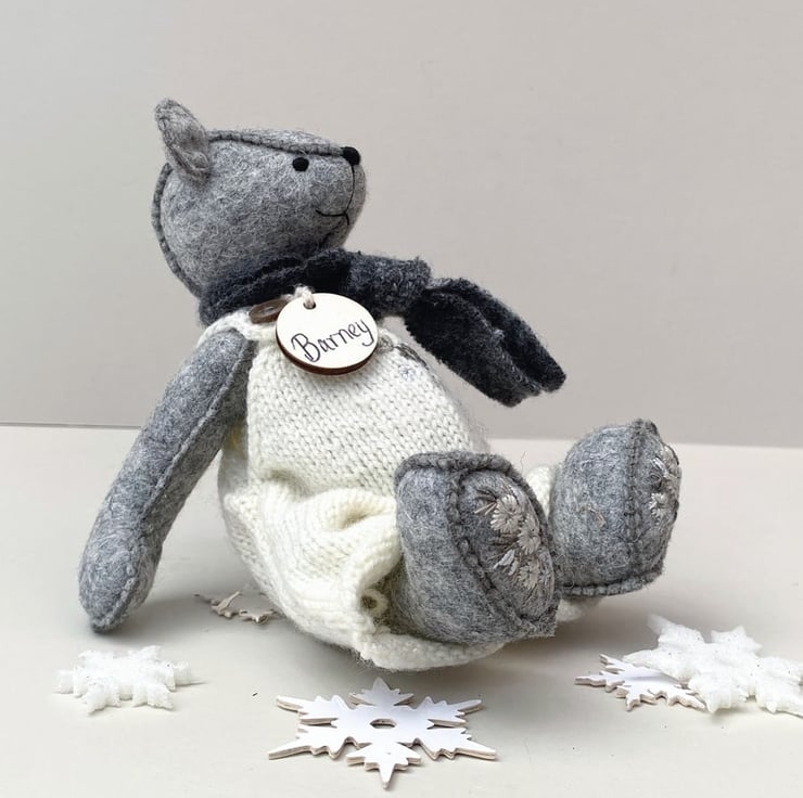 Barney wears hand knitted dungarees in ivory cream 4ply yarn, finished with little buttons to the straps and a small embroidered floral motif to the front. A little grey wool scarf keeps him warm in the winter months,