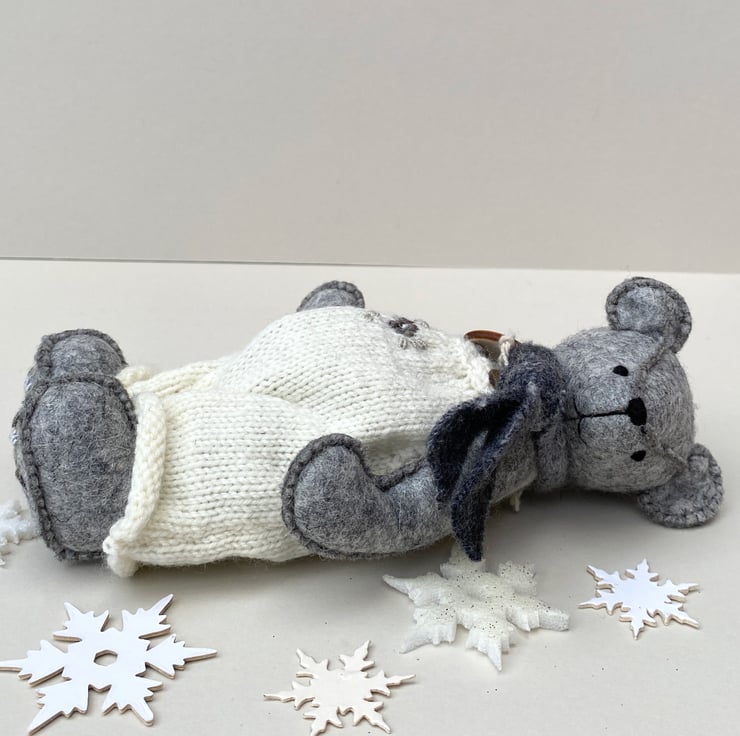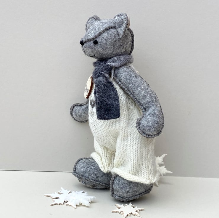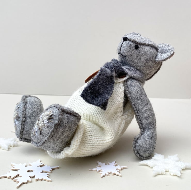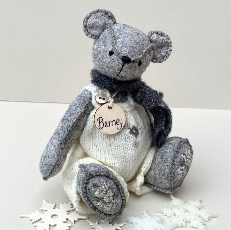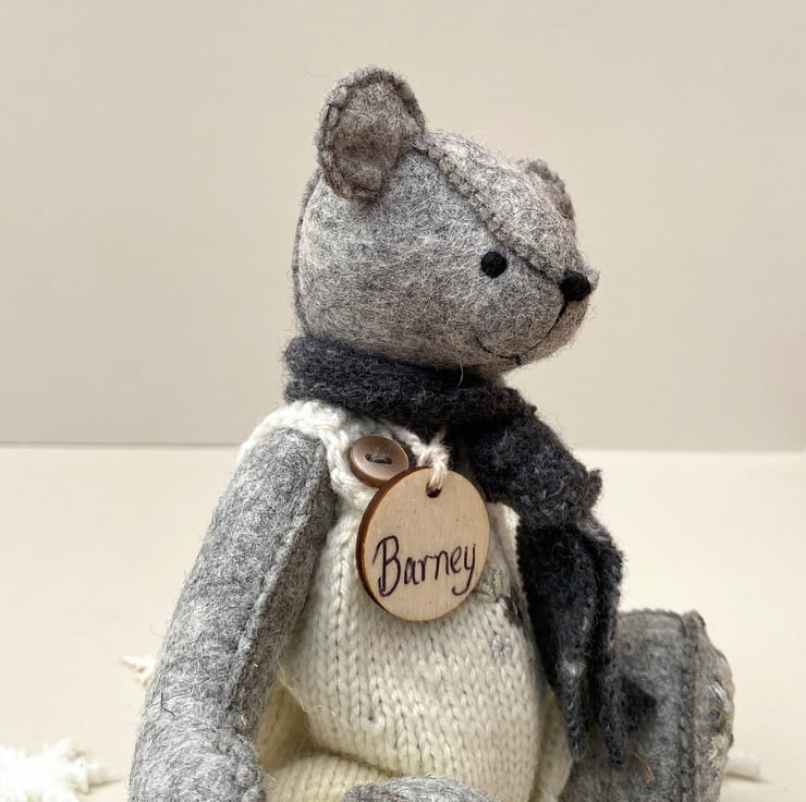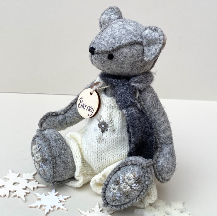 Meet Barney, a Signature bear with triple sewn seams to the right side of the fabric handmade from premium 2mm 100% wool felt in light grey.
