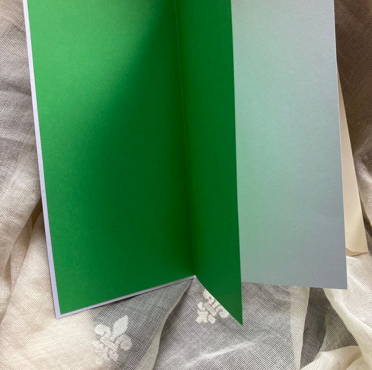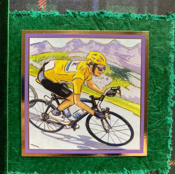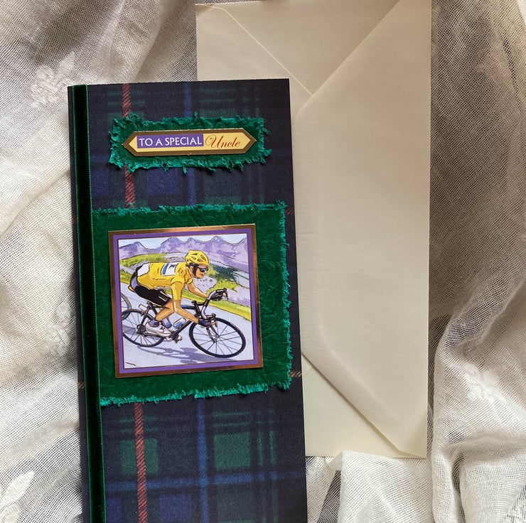 This is a handmade tartan card suitable for that uncle who enjoys cycling. The tartan is red, green and blue.The inside of the card is white with the insert green and envelope ivory.