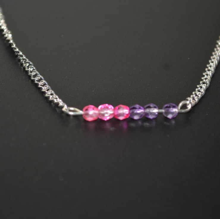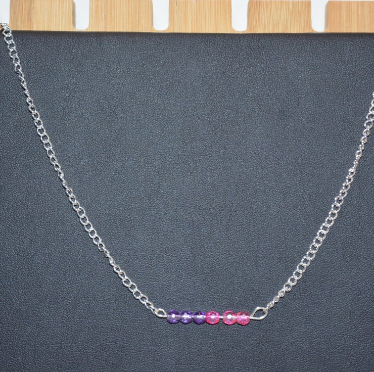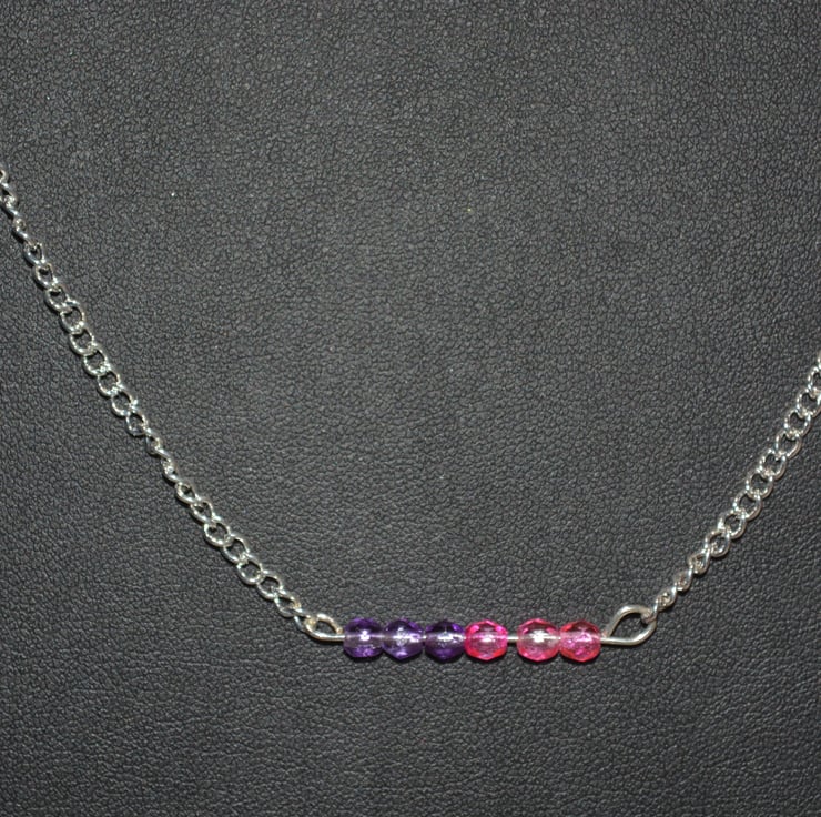 The necklace is a silver chain with a thin piece of metal in the centre of the necklace. The necklace has glass fire polished faceted beads on it that go from purple to pink and there is 3 of each bead. The necklace fastens with a silver clasp at the back. The necklace is approximately 19 inch in length.