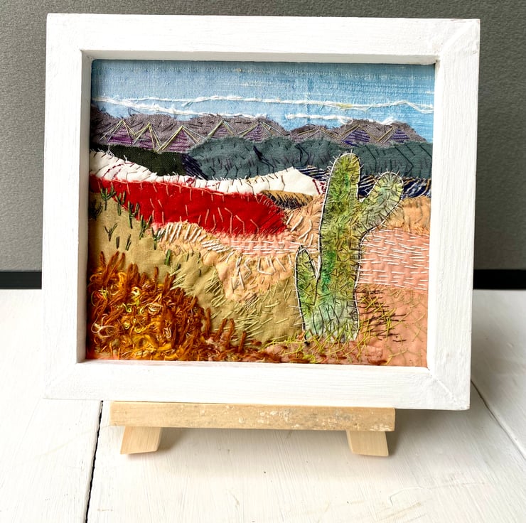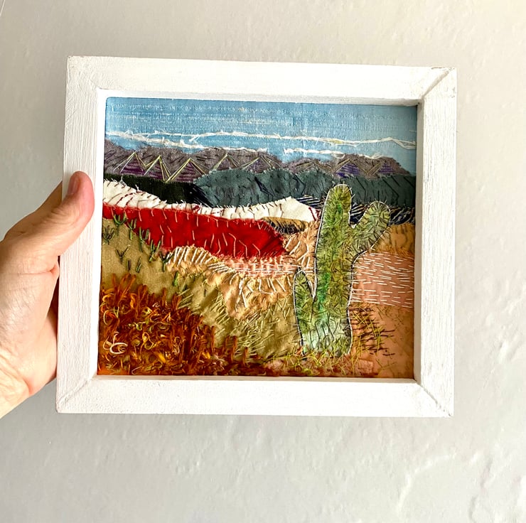 A prickly cactus stands tall in the rugged landscape against a mountain backdrop. Completely hand stitched, I’ve used a mix of hand dyed and painted fabric remnants to create the collage.