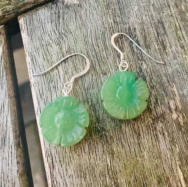 Sterling silver earrings with a jade flower drop. Jade flower is approx 12mm in drop. Limited edition of only two pairs made. Free gift box tied with ribbon.