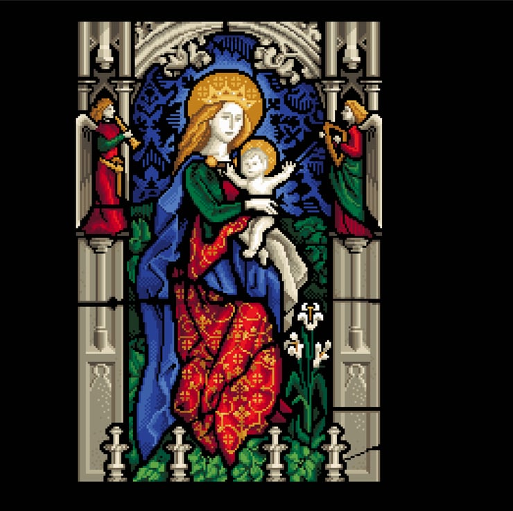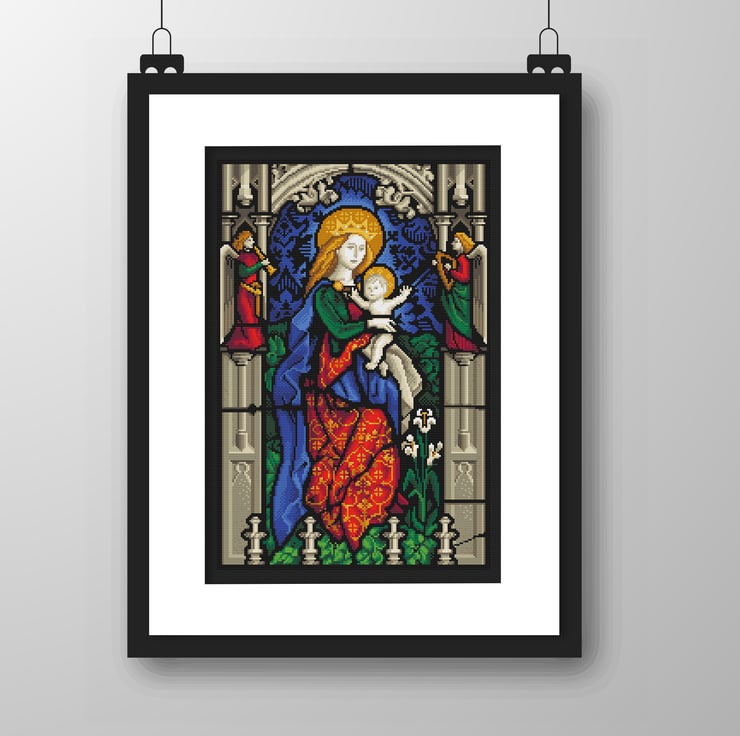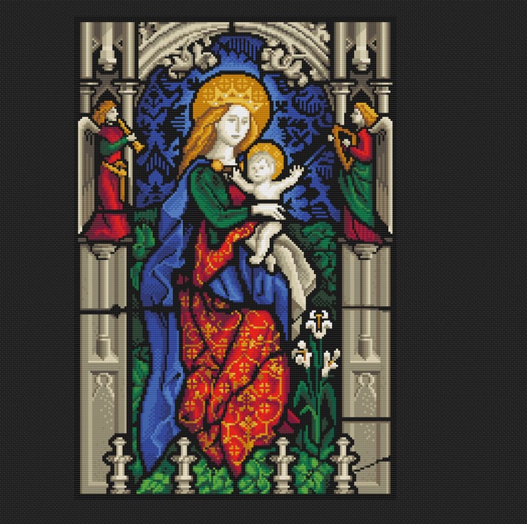 Cross Stitch Pattern Christmas Madonna Mary mother and child with angels stained glass reproduction Peter Hemmel c1480 PDF counted chart 291