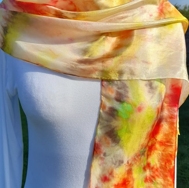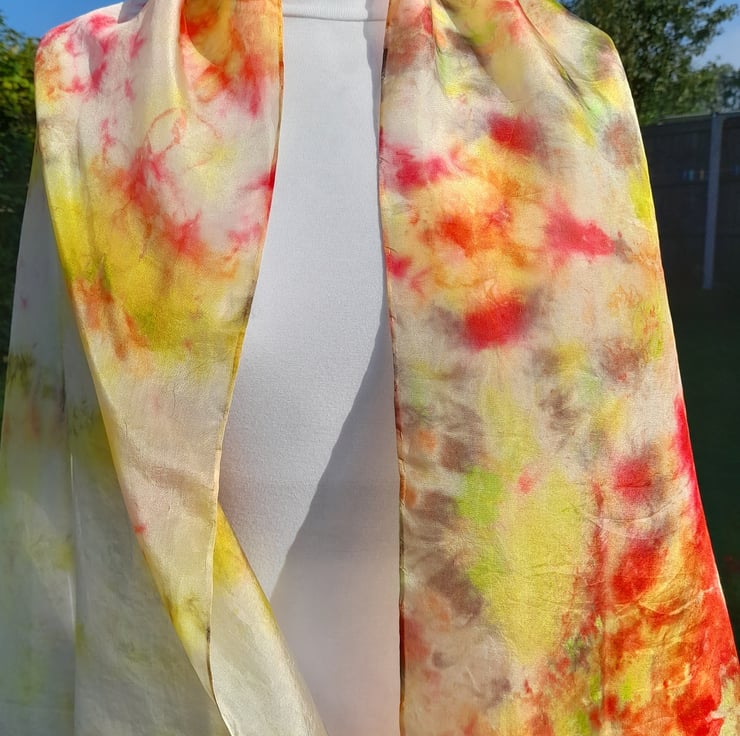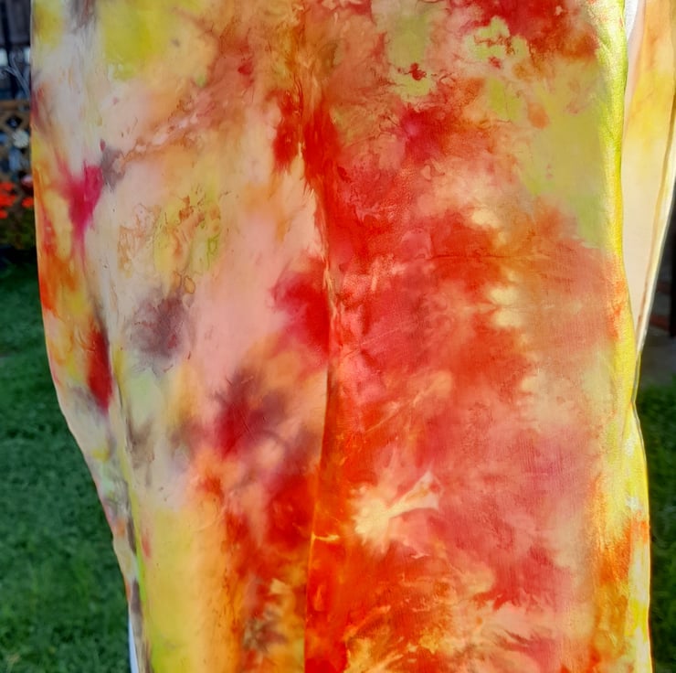Zingy ! a unique hand dyed pure silk scarf in yellow and red, with touches of green. The silk dyes have created fabulous colour shadings and patterns, The silk (Ponge 5) is light and floaty with a lovely soft sheen. Wear with a simple white or black shirt or top to show the colours off. A fantastic gift for anyone.