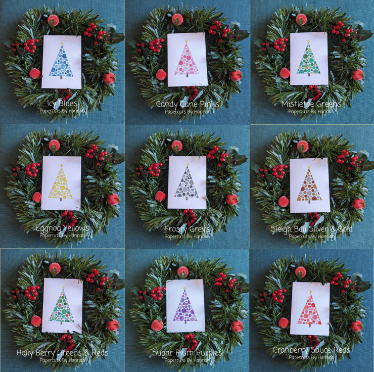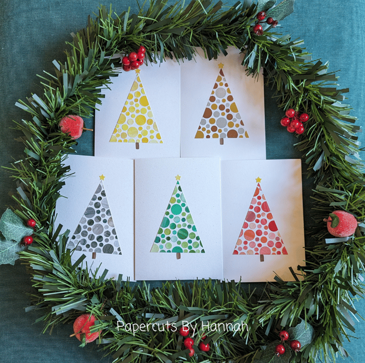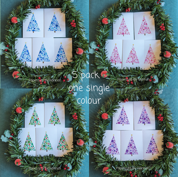 Each tree was made (by me) from a number of hand-painted and punched circles, which have been meticulously cut and glued down to create Christmas tree shapes! Every single one is completely different, and each one takes approx. 15-20 mins to make!