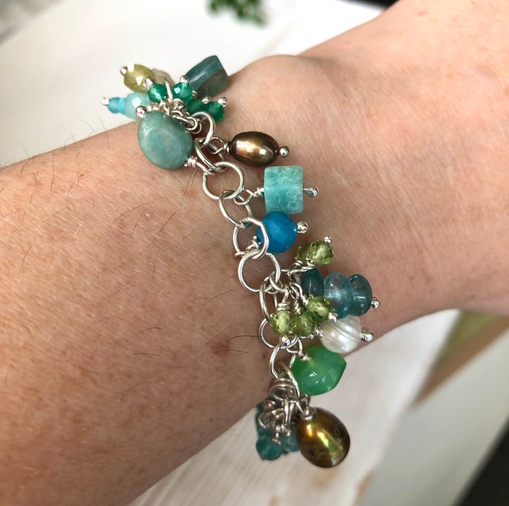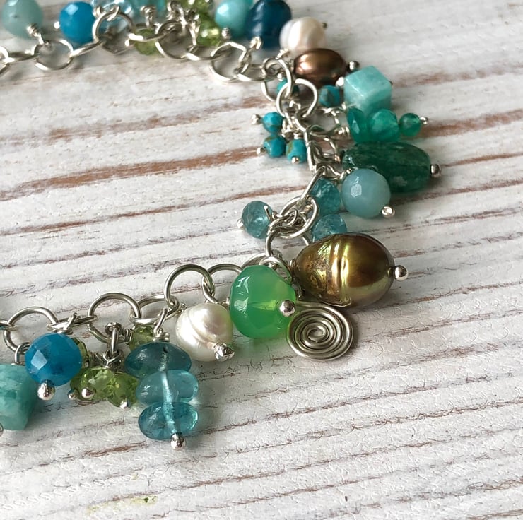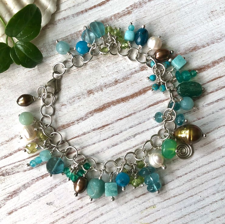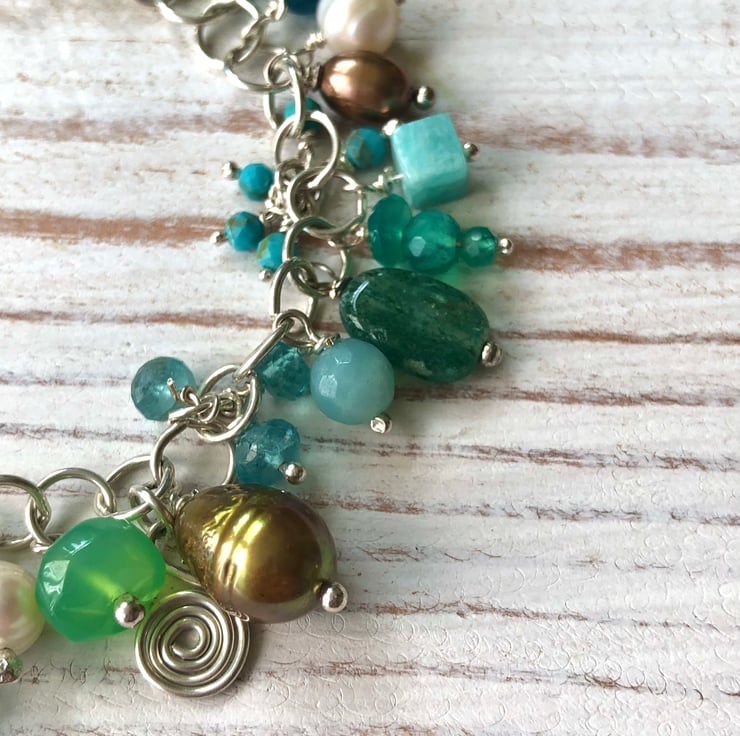 'Ocean Bracelet' featuring a variety of gemstones including Amazonite, Peridot, Turquoise, Chrysoprase, Apatite, Onyx & freshwater pearls.