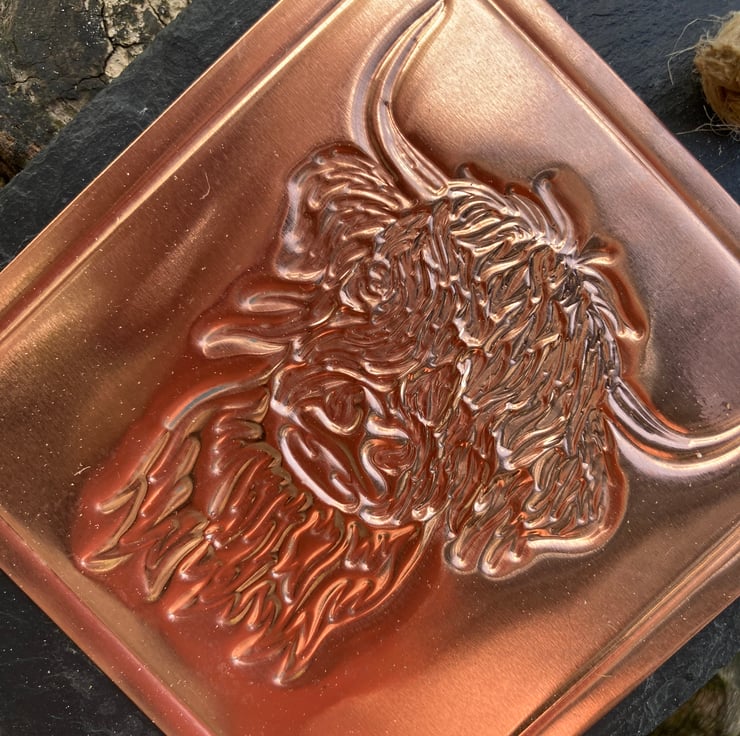 This is so cute, a Highland Coo, in rich copper mounted on reclaimed roof slate. It measures approx 10cm x 12cm, although varies slightly depending how the slate cuts!
