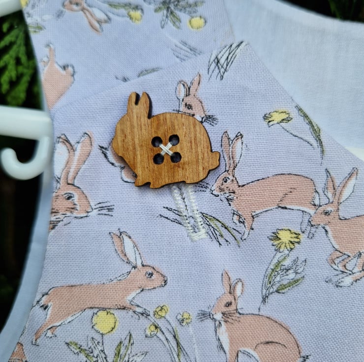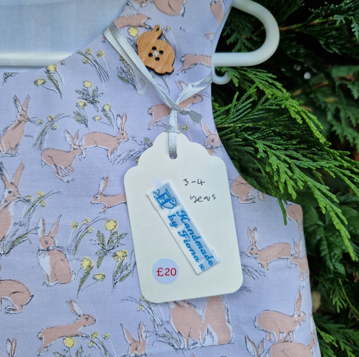A fully lined A-line summer dress. Made from a very pale lilac cotton fabric with a print of rabbits and daffodil type flowers and with wooden rabbit shaped buttons. Can be worn with a T shirt underneath, tights and a cardigan for colder days.
