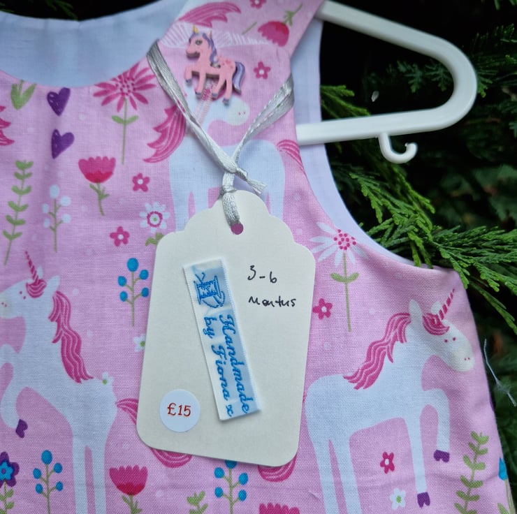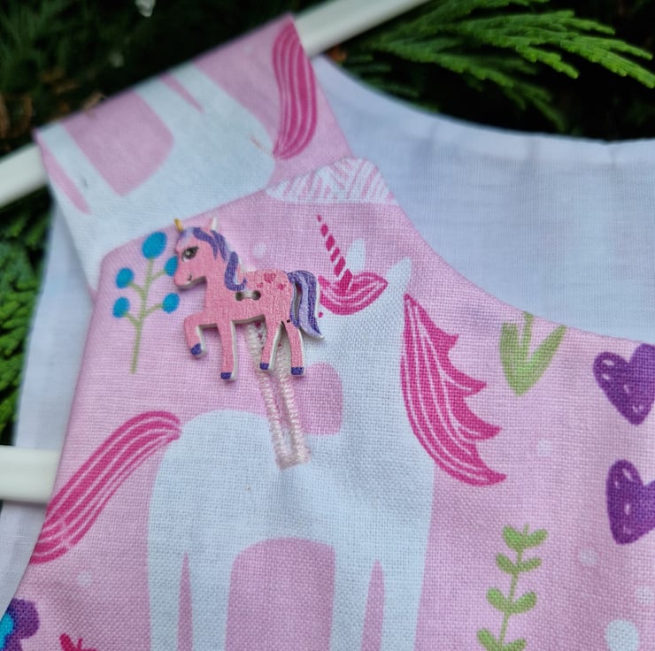 A fully lined A-line dress made from a pale pink cotton fabric with a print of pink unicorns, purple hearts and mixed coloured flowers and coordinating pink wooden unicorn shaped buttons. Can be worn with a long or short sleeve T shirt underneath and cardigan on top.