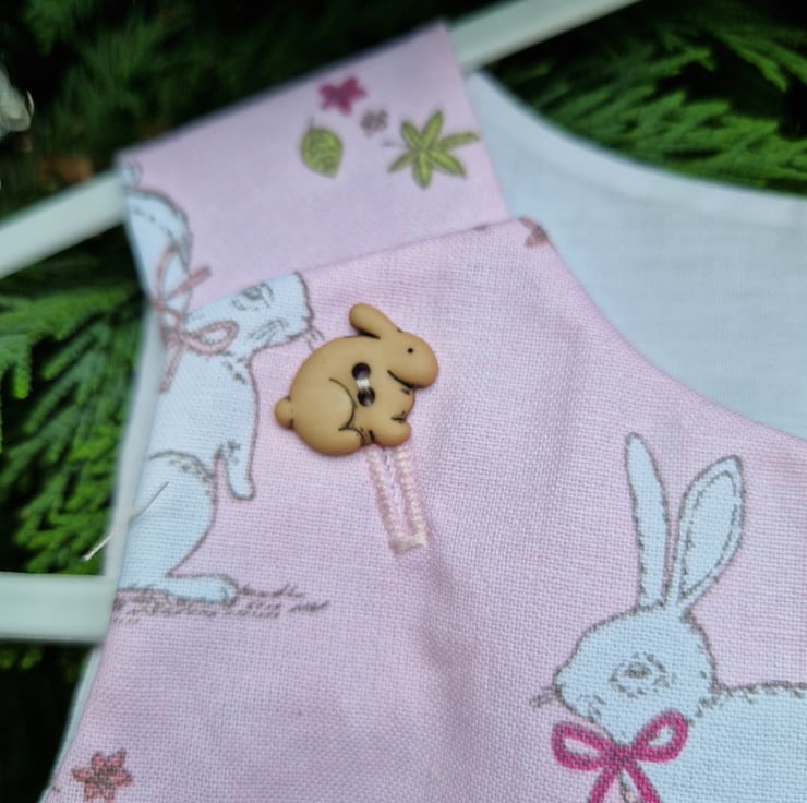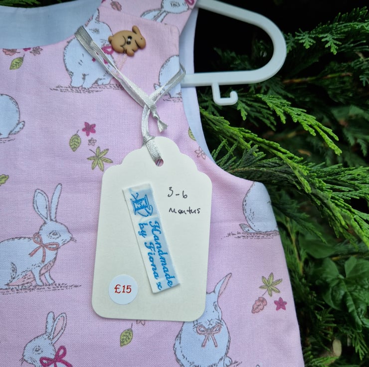 A fully lined A-line dress made from a pale pink cotton fabric with a print of white rabbits with pink and green bows and coordinating plastic rabbit shaped buttons. Can be worn with a long or short sleeve T shirt underneath and cardigan on top.