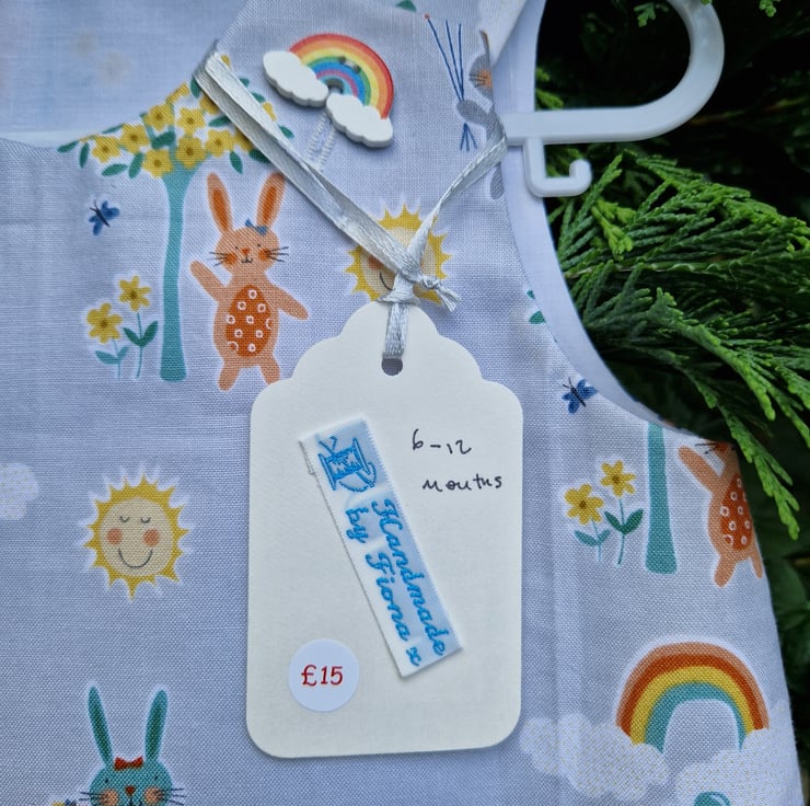 A fully lined pinafore A-line dress made from a pale grey cotton with rabbits with balloons, sheep, flowers and rainbows and with wooden rainbow shaped buttons. It can be worn as it is, or with a long or short sleeve T shirt underneath and cardigan on top on cooler days.