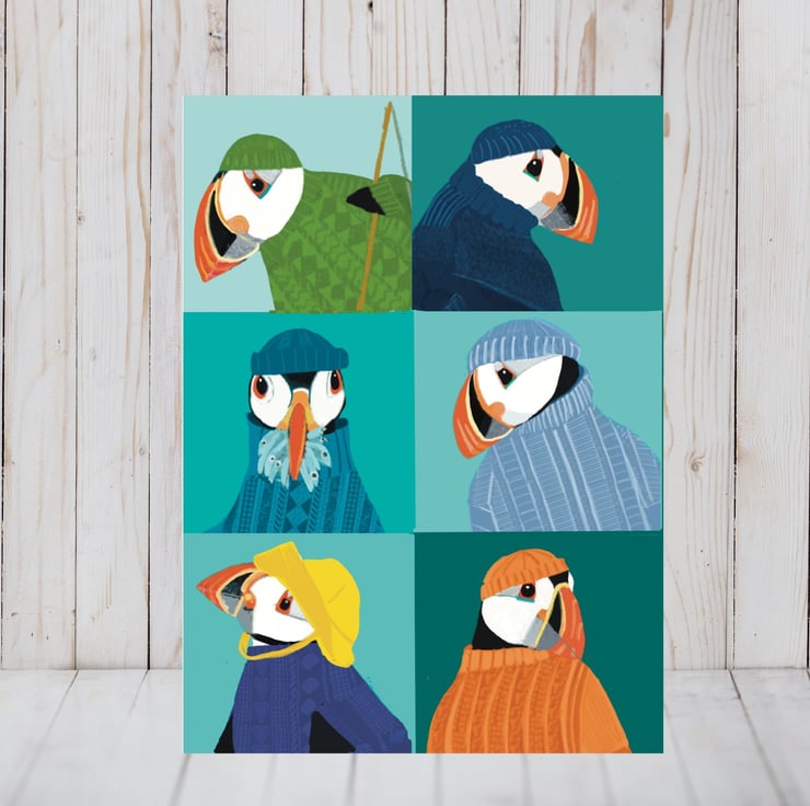 All my Yorkshire Puffins together on one card. A great fun illustration of my very popular puffins in their Gansey jumpers. Blank inside for your own message and perfect as a little note, a thank you or a special greeting.