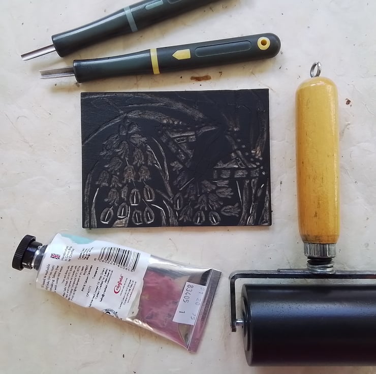 Woodcuts are sold unframed, and sent in a card-backed recyclable clear protective sleeve, packaged with more cardboard.