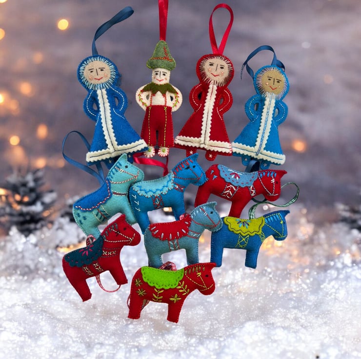 All of my makes are eco friendly and made to last from 100% wool felt and stuffed with washed wool fleece sourced from Yorkshire. I use DMC cotton thread to embroider folk patterns and stitches creating totally unique heirloom treasures.