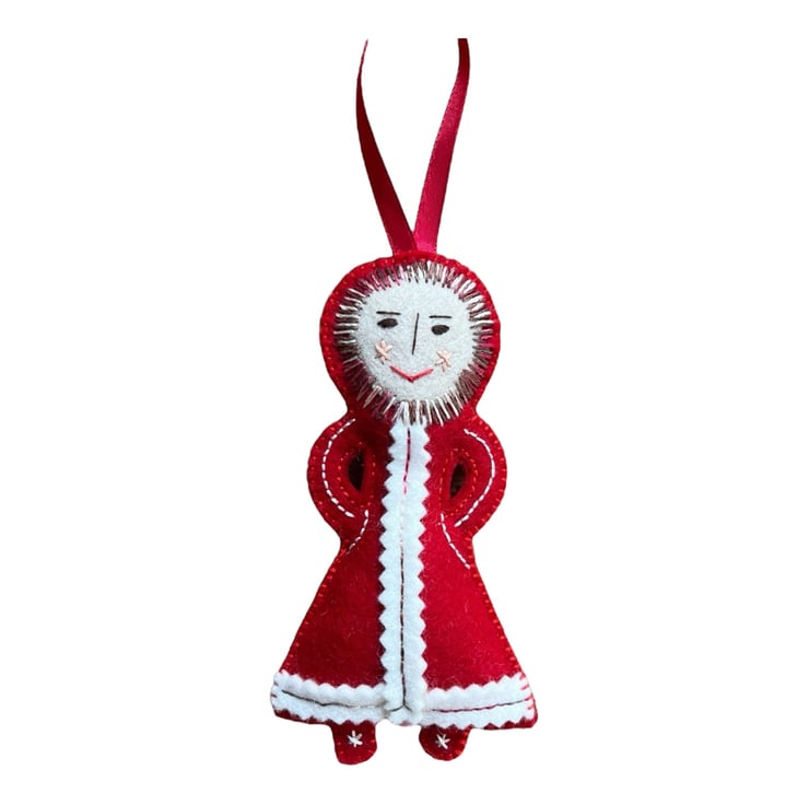 She is made from wool felt and wears a bright red coat with ecru trimming. I used DMC cotton thread for the decorations and she is stuffed with washed wool fleece.