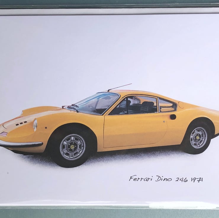 HISTORY - The Ferrari Dino was named in memory of Enzo Ferrari's late son, Alfredo Ferrari known as Dino. Although there were competition cars prior that carried his name, the first road car was the Dino 206 with a 2 litre V6 engine launched in 1967 that was updated to the 246 in 1969 with a 2419cc V6 engine and a steel body replacing the the previous aluminium one which is the one depicted. Production ceased in 1974 and replaced by the 308 with a V8 engine, a first for Ferrari.