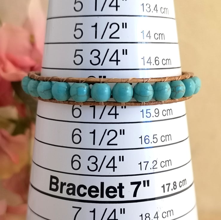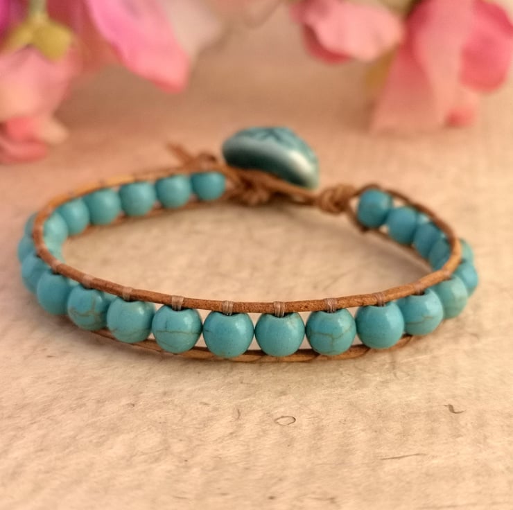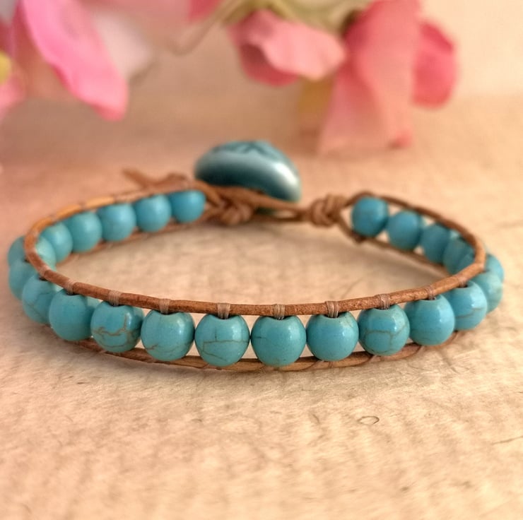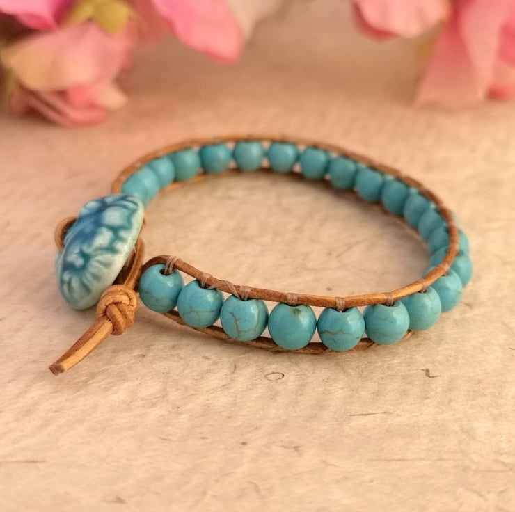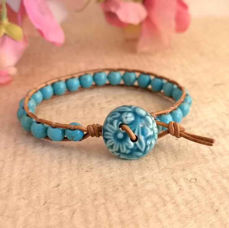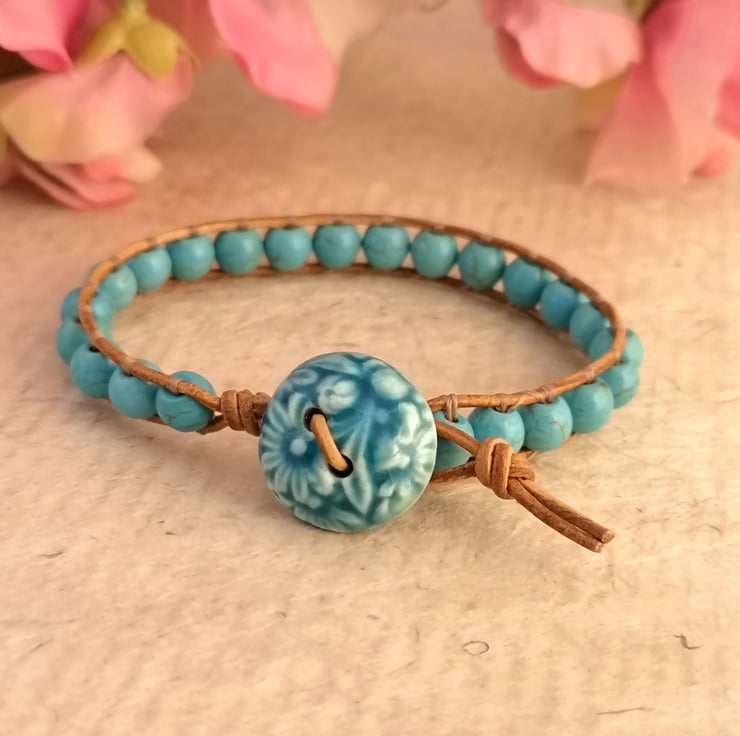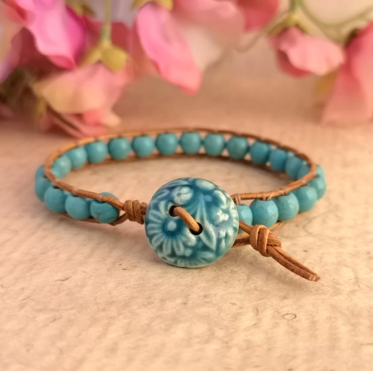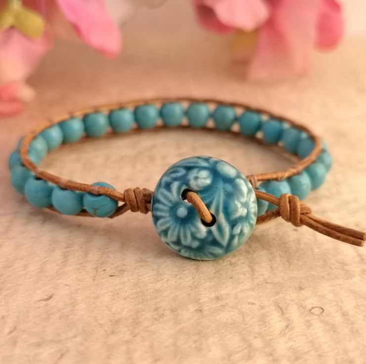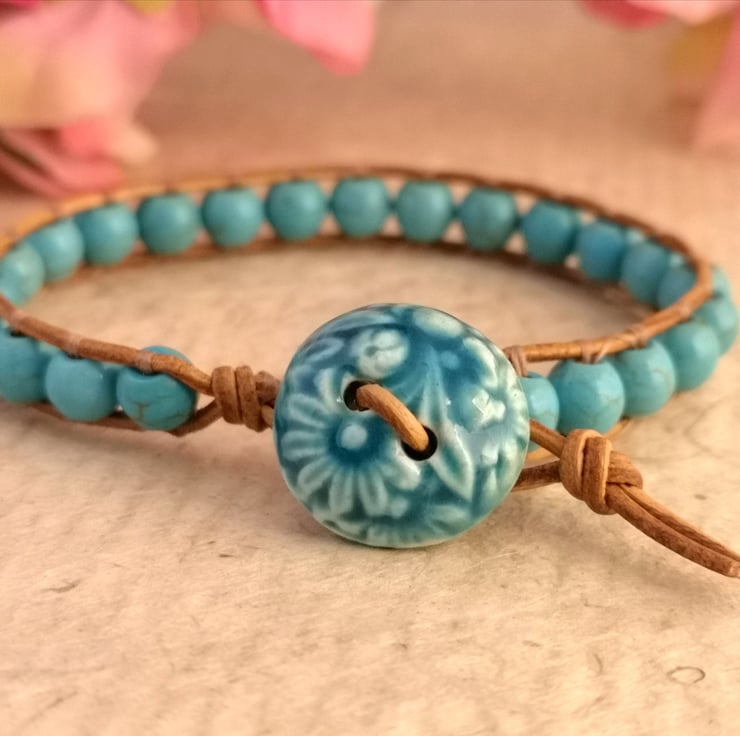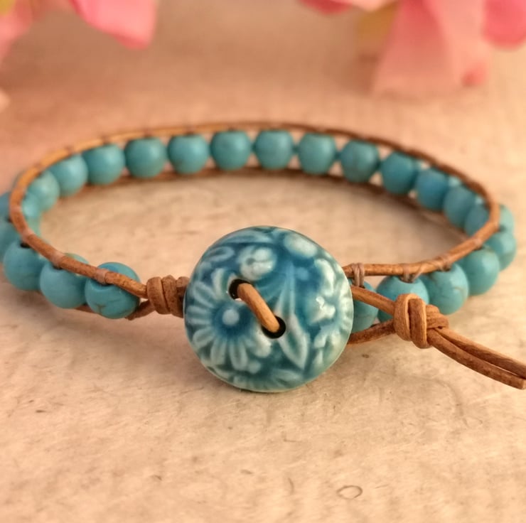 This bracelet is made from soft tan leather cord and vibrant turquoise beads. Turquoise is a cherished gemstone which is known for its protective and healing properties, and is also a December birthstone. The bracelet is finished with a beautiful ceramic button with a delicate floral pattern.