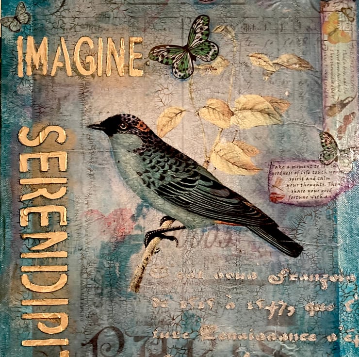 The words Serendipity, Soar and Imagine have been added with modelling paste so that the words are raised and then painted in gold .