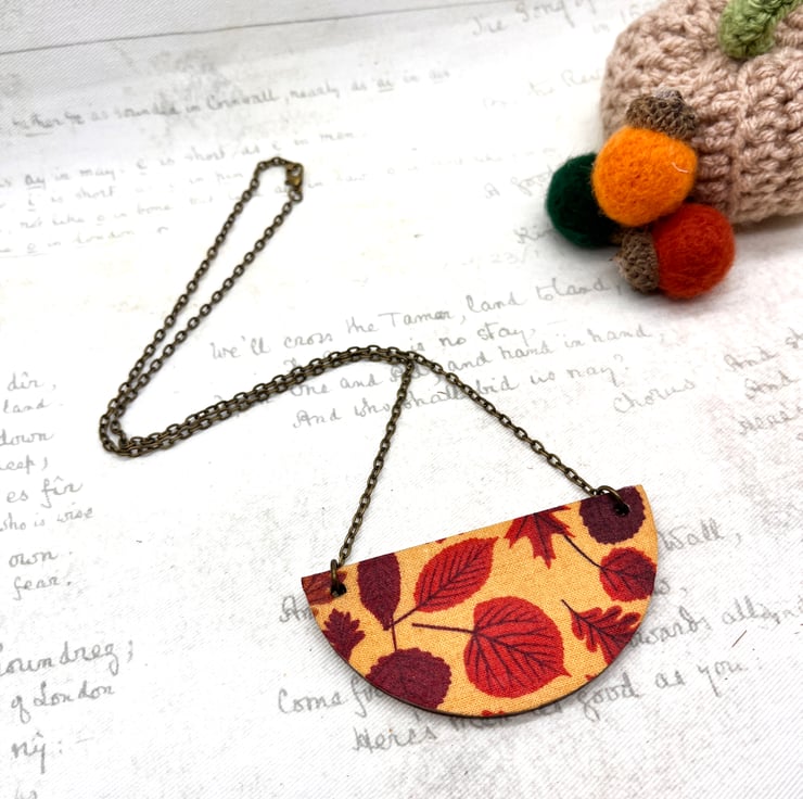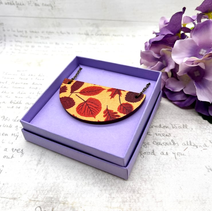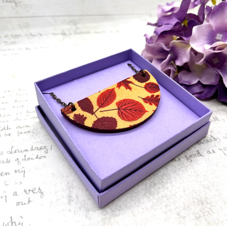 Made from fabric and plywood this stunning necklace, celebrates British native trees in autumn and showcases oak, hawthorn, lime, and maple leaves in russet orange and brown tone, on a creamy yellow background.