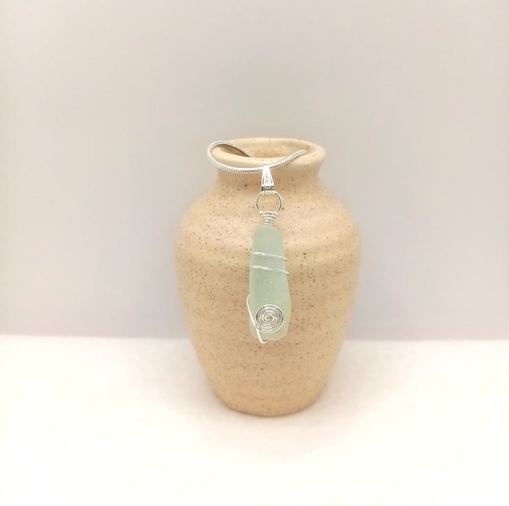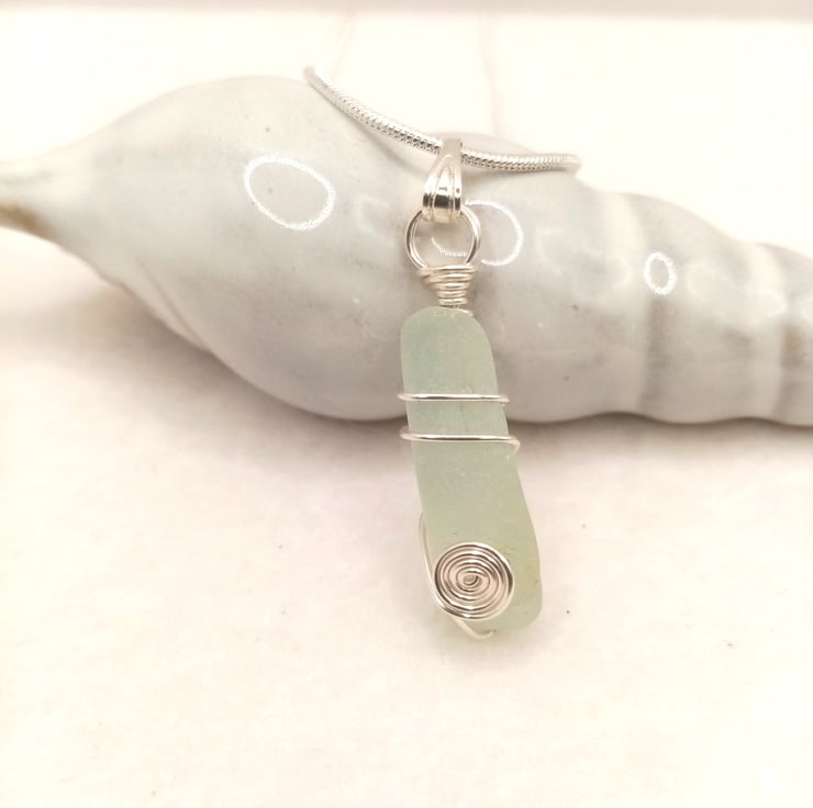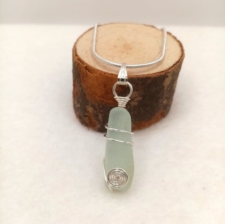 Wire wrapped sea glass necklace in soft aquamarine with silver plated snake chain.