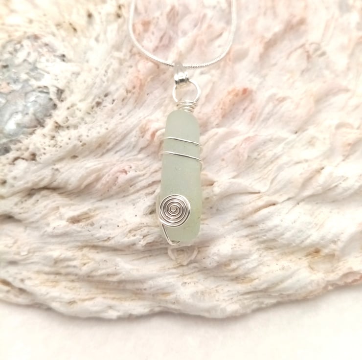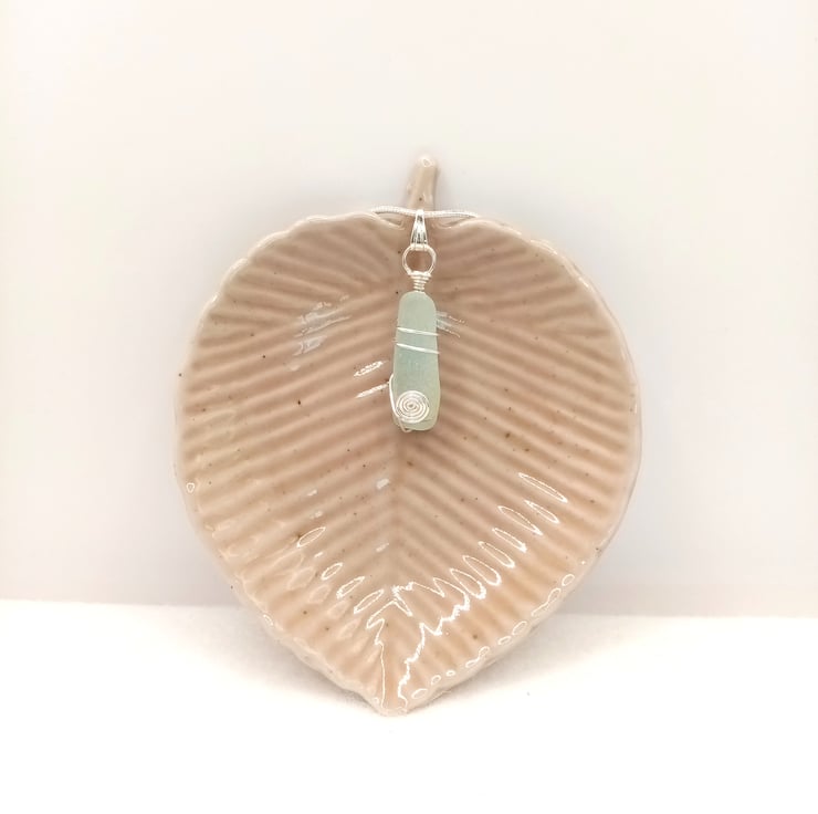 Let the joys of ocean treasures shaped and frosted by endless rolling waves enthral and delight your days with this soft aquamarine coloured sea glass pendant.