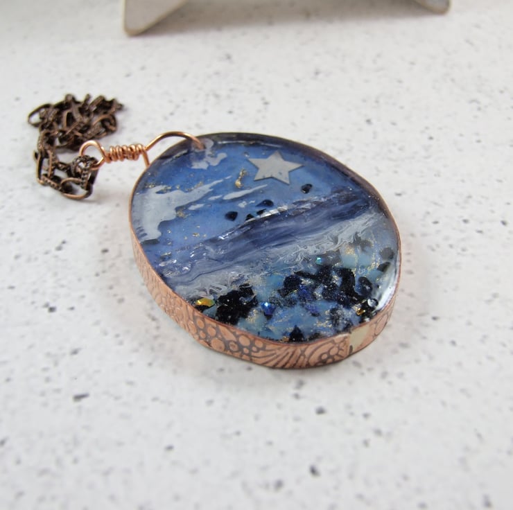 Hanging Starlight Beach Decoration. Unique resin art handcrafted with resin and metal leaf a sterling silver star and hand painted inks. Set into a copper bezel with copper chain to hang. This would also make a lovely and different christmas tree decoration that will last for years.