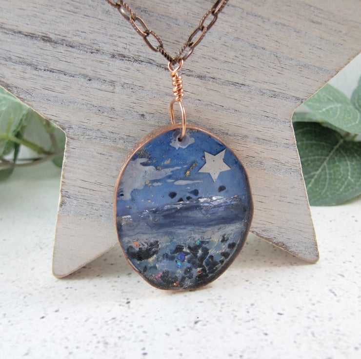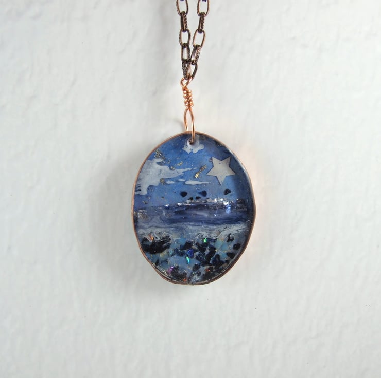 I began with a base layer of resin, then added copper leaf and foil to create the background for the sea and sand. Next came a sterling silver star and some glass shards. Next a layer of handpainted inks for the sea and sky and a final layer of resin to seal it all together. I created a copper wire bezel to hold the resin and added a copper chain to hang the decoration.