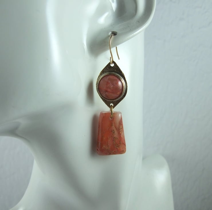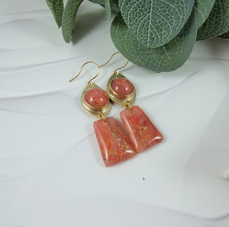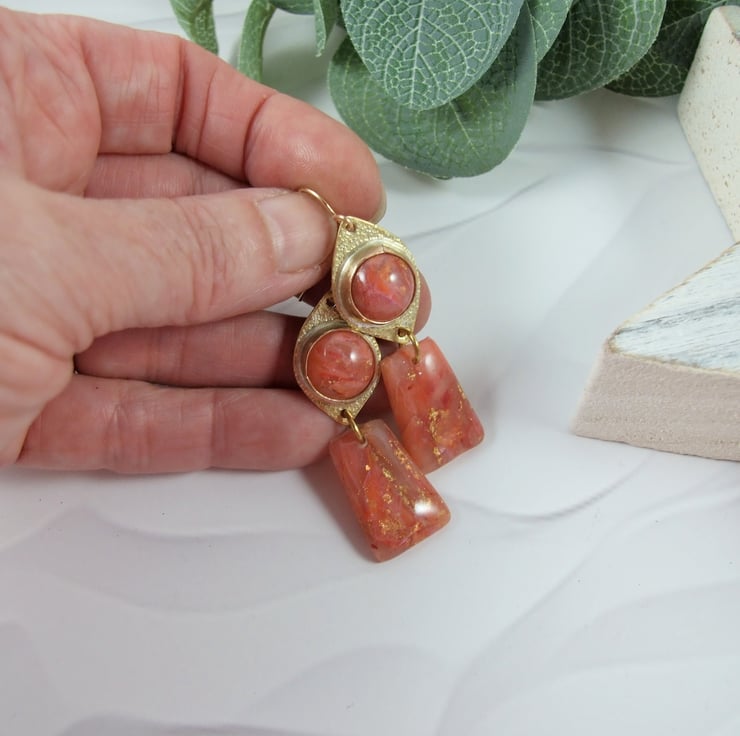 I began with the polymer clay, combining peach, translucent, inks and gold leaf to create a marbled effect. Once cured I have coated in resin to protect and give a high gloss finish. The top part has been cut in a lozenge shape from brass sheet to create the bezel setting and I have added 14ct Gold Filled ear wire.