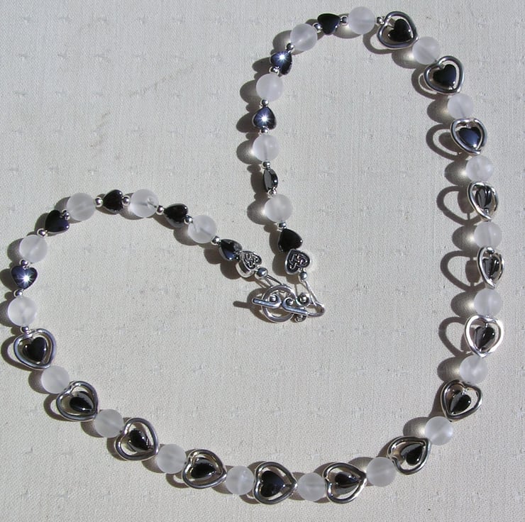 The Central swathe of this Stunning Necklace is made from alternating Frosted Clear Quartz round beads and Black Hematite Heart shaped beads… which are floating/suspended inside Tibetan Silver Heart Frames – this then flows more alternating Quartz and Hematite Heart beads this time alternated with a tiny silver spacer bead with a Tibetan Silver Celtic Heart at each end… A Striking cool combination that will look stunning for either the casual look or wear it with something more Elegant for a Special Evening out