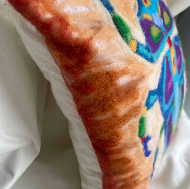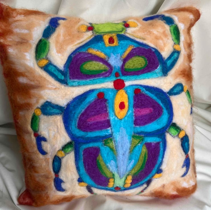 Award winning needle felted cushion cover depicting scarab beetle. Cream calico back. Stuffing included.