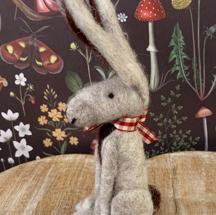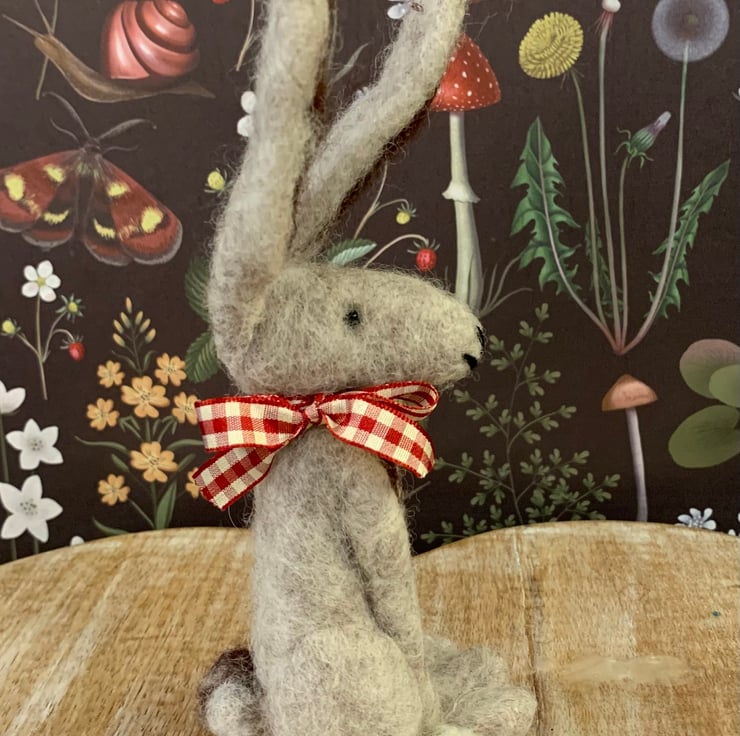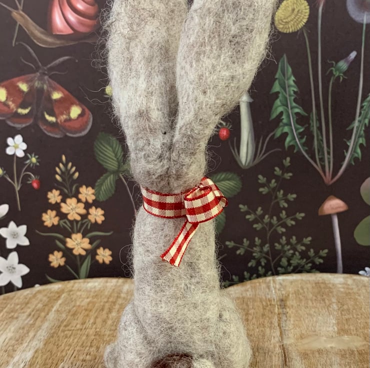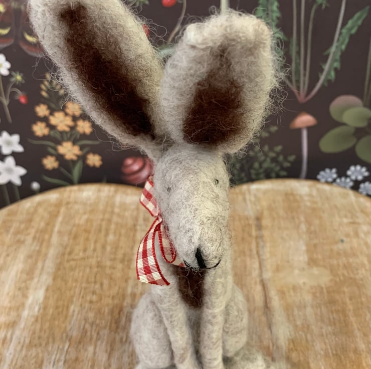 A needle felted hare with standing up ears and a brown bib. 20cm tall from base of his fluffy feet to top of his fluffy ears. He has seed bead eyes and a cute red check bow. As with all my needle felted animals he’s not suitable for children due to small parts.