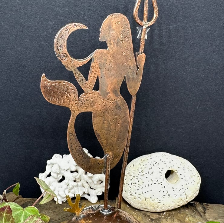 I have made this mermaid using traditional jewellery/metal craft techniques. Each one is unique, using my jewellers saw to pierce out shapes, soldering, hammering and adding detail using metal punches. The mermaid holds a trident embellished with a little garnet cabochon; for me this trident signifies strength and protection. I have oxidised the piece to highlight detail.