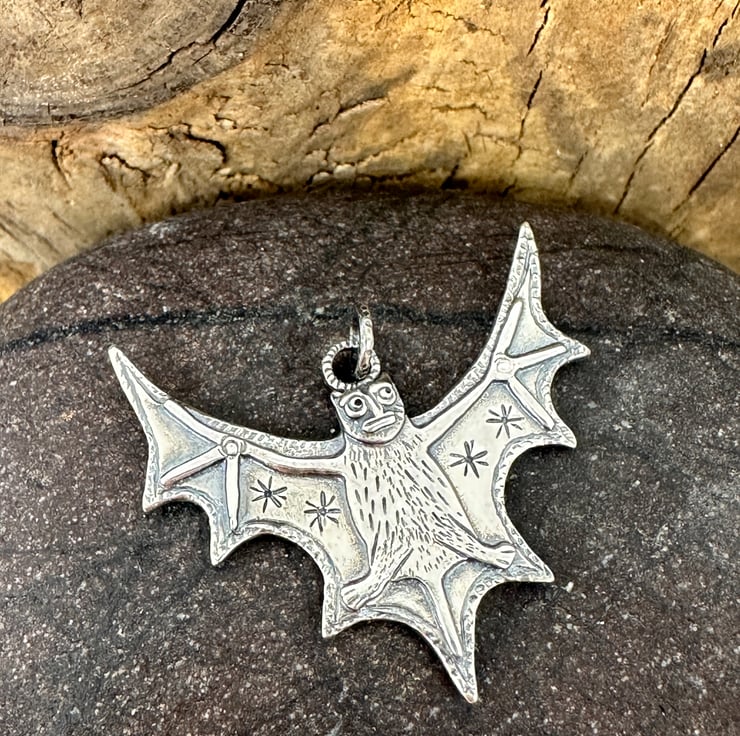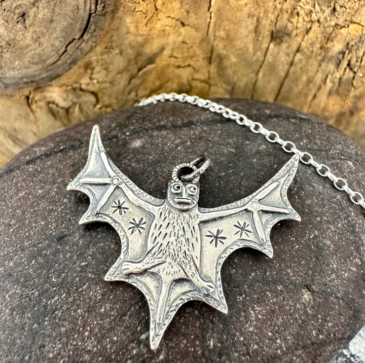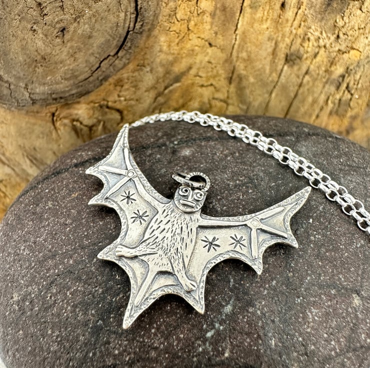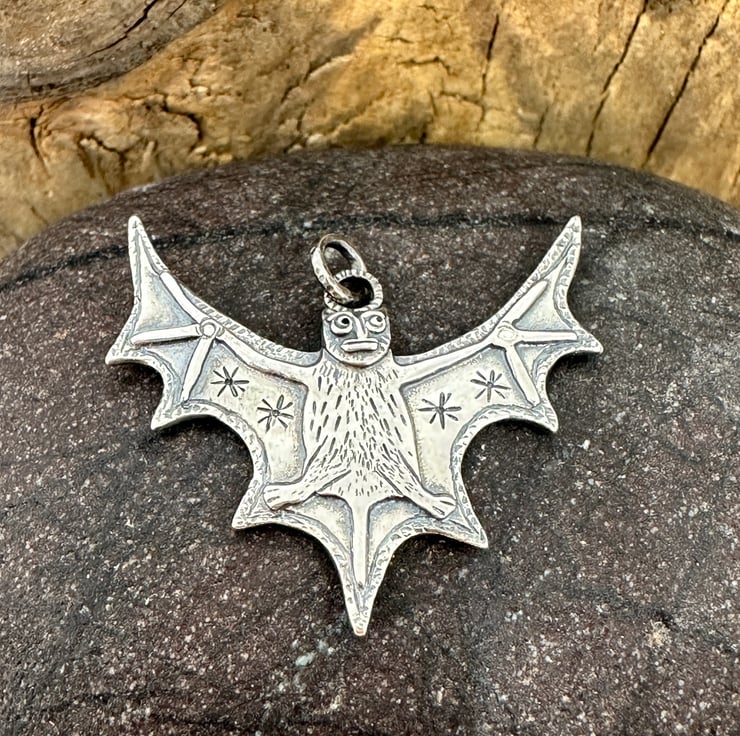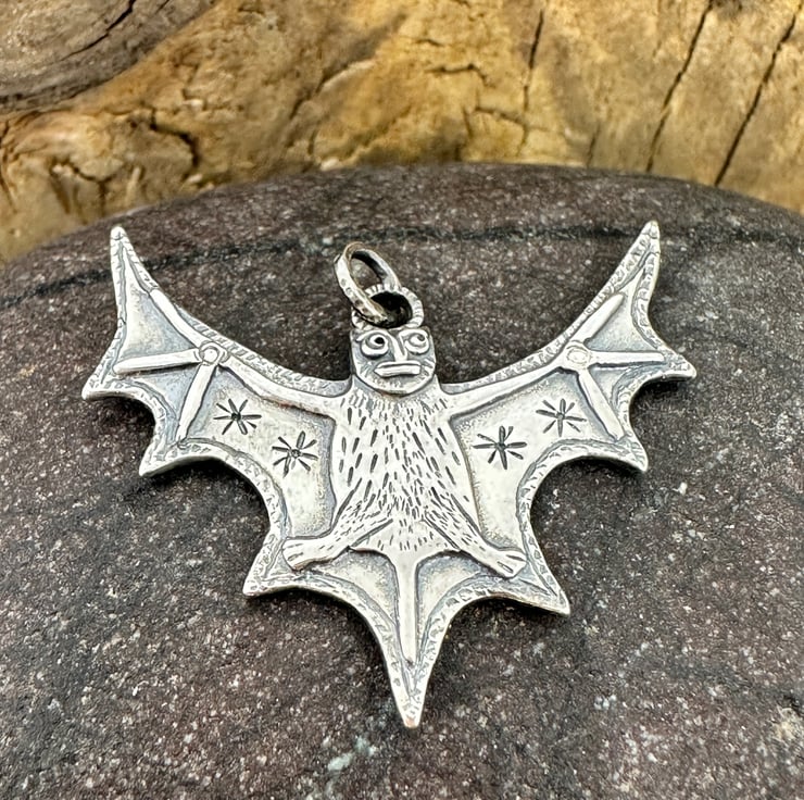 I have taken inspiration from medieval art, particularly the Aberdeen bestiary to create this bat pendant which measures approx 32mm x 30mm.