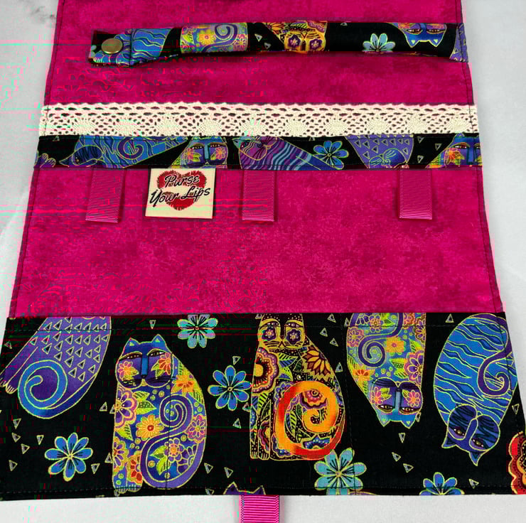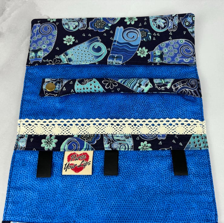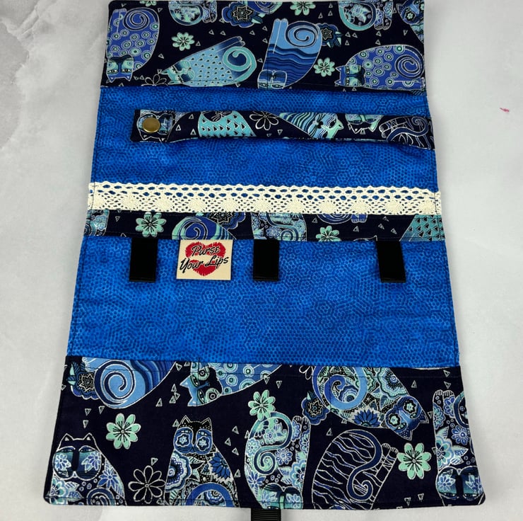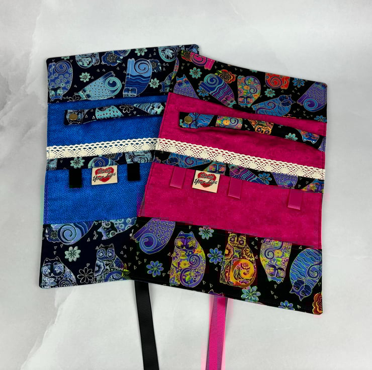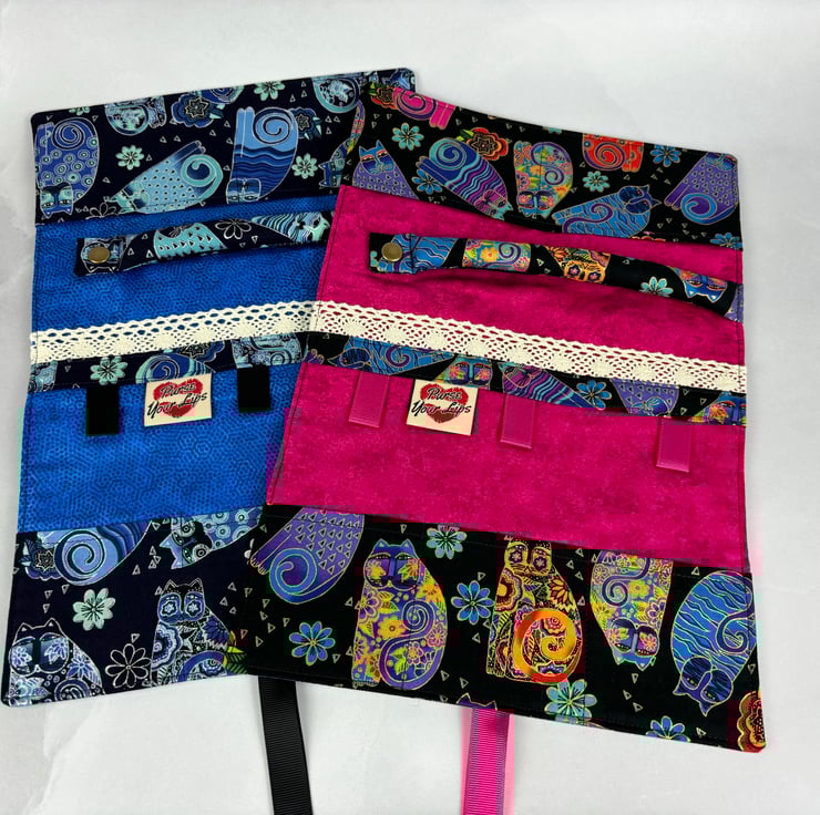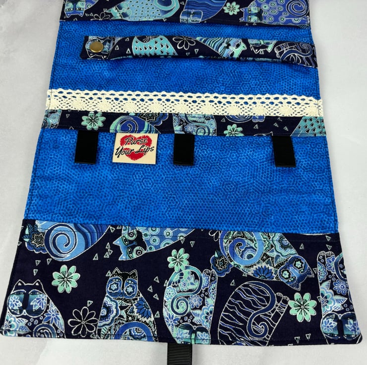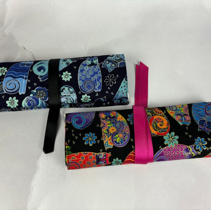 Handmade fabric jewellery roll in a stunning tumbling cats cotton fabric in a choice of colours and lined in complimentary cottons. The blue option is beautifully accented in silver and the multi-coloured is accented in gold.