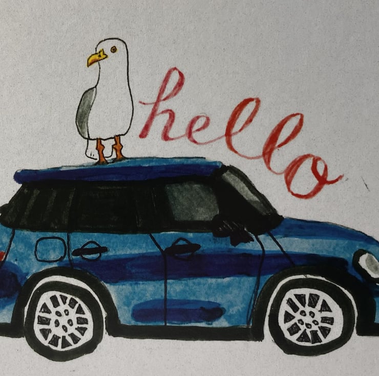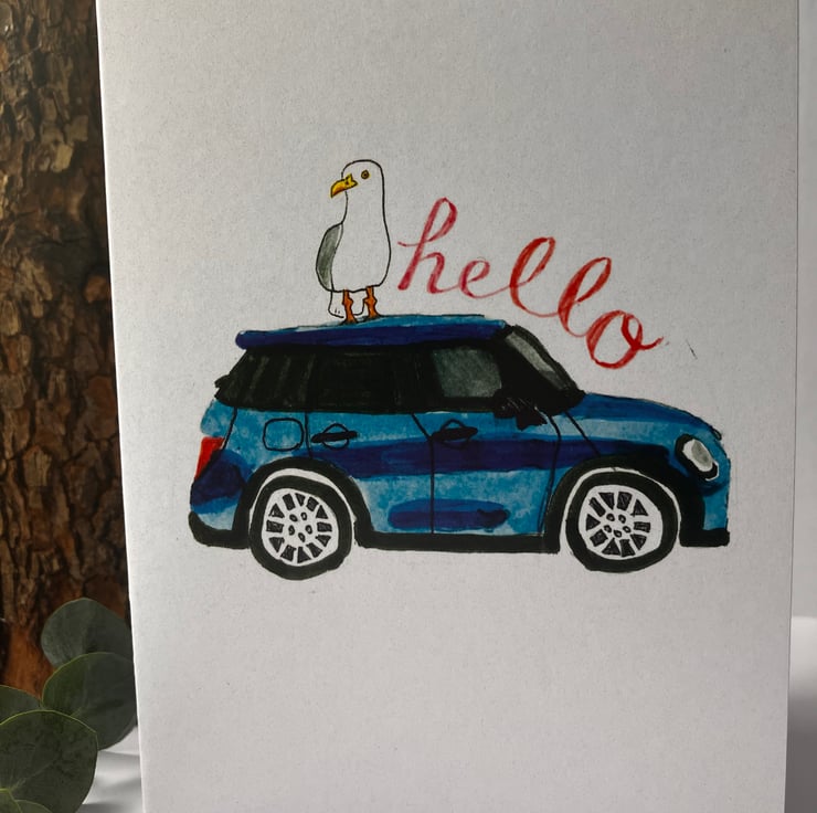 A colourful greeting card with a quirky little seagull perched on a blue mini.