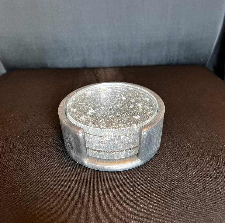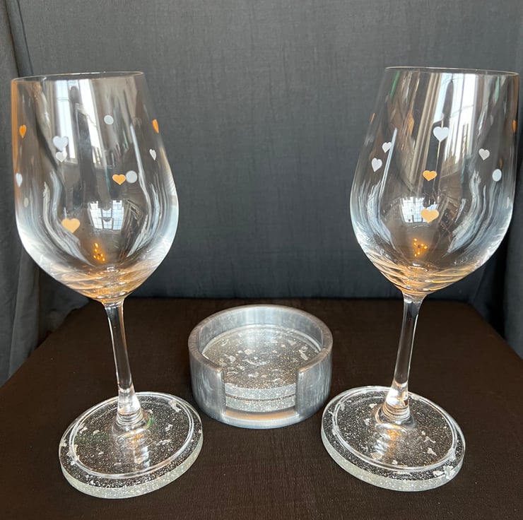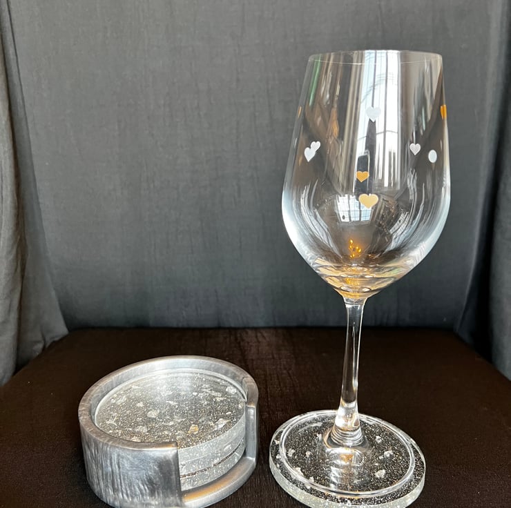 Beautiful set of 4 circular coasters with holder made with Epoxy resin. (Wine glasses not included)