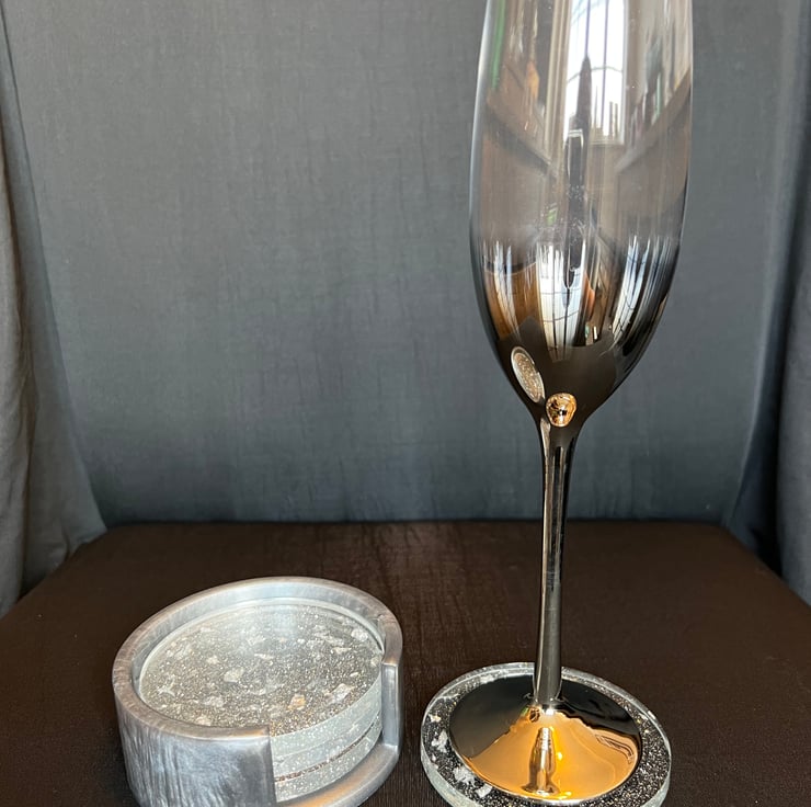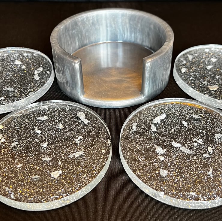 Coasters are clear with silver glitter and silver foil leaf and are approximately 86mm in diameter and the holder is silver Mica powder which gives it a shimmery effect.
