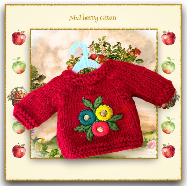 A cosy red jumper, decorated with embroidered stylised fruits, in the colours of ripe apples, to fit the Mulberry Green characters. The jumper is hand knitted and fastens with a little popper at the back.