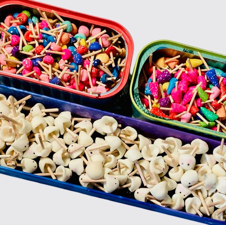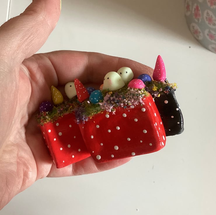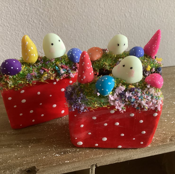 The base is made from air dry clay painted in acrylic paint. The ghosts and toadstools are also handmade by myself.