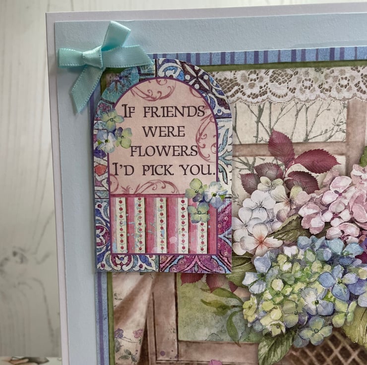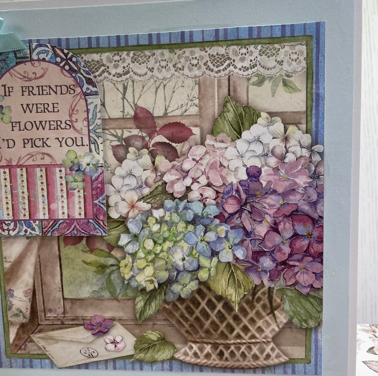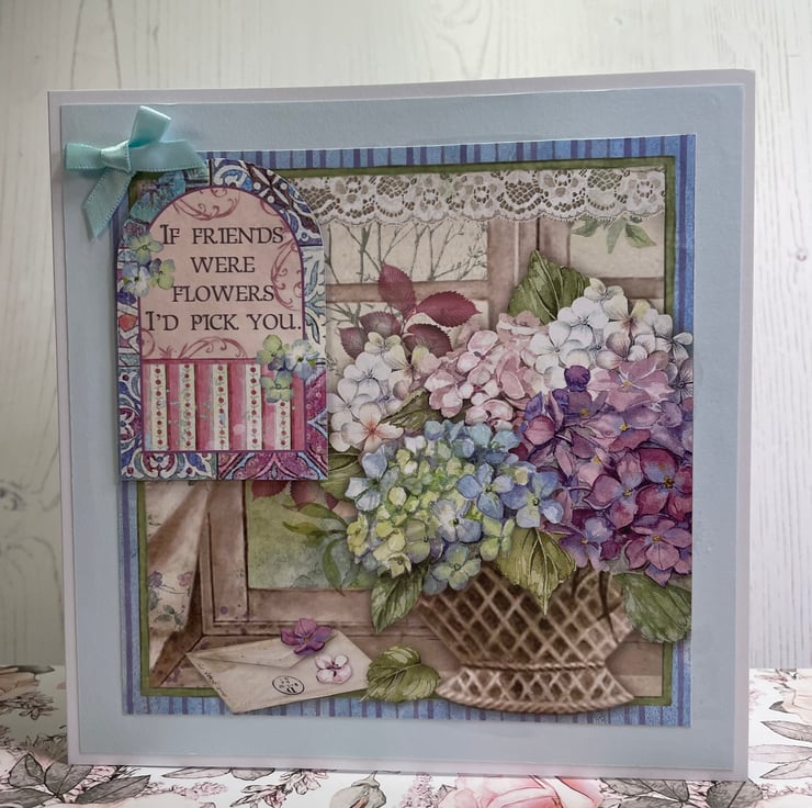 Hortensia/Hydrangea themed card. Pale blue matting layer with a beautiful design in a vintage style, plain insert for your own message. Blue ribbon bow. Measures 7” x 7”. Wording on front of card ‘ If Friends were Flowers I’d pick you’