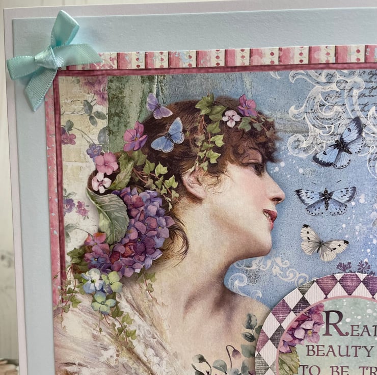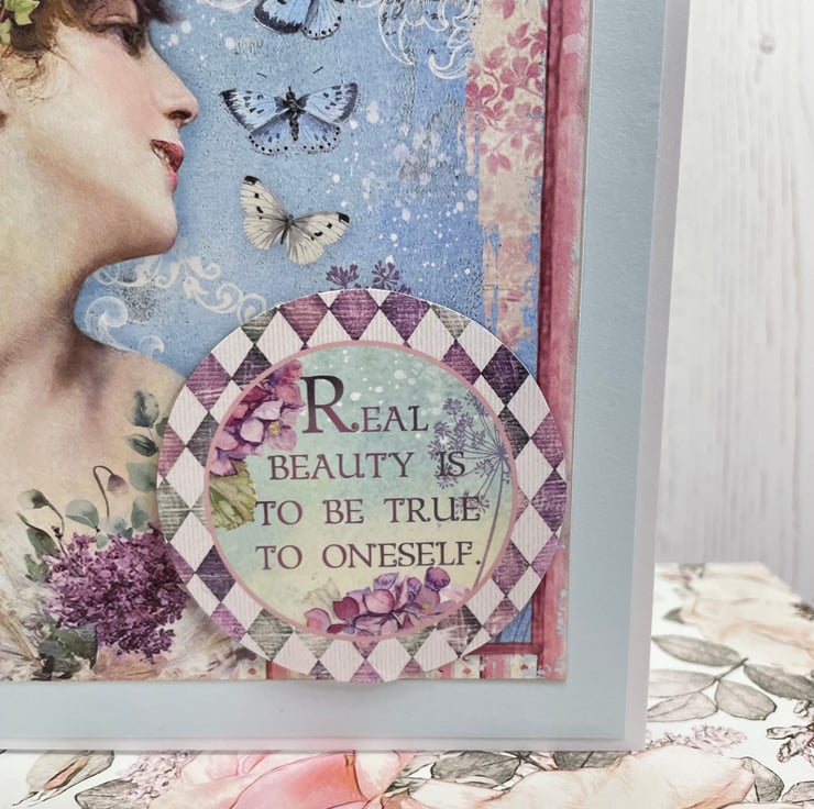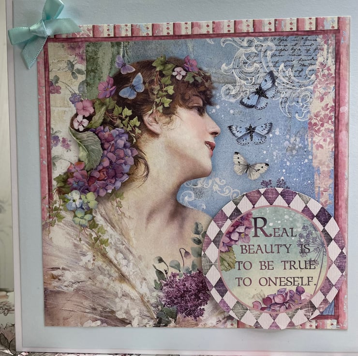 Hortensia/Hydrangea themed card. Pale blue matting layer with a beautiful design in a vintage style, plain insert for your own message. Blue ribbon bow. Measures 7” x 7”. Wording on front of card ‘ real beauty is to be true to oneself’