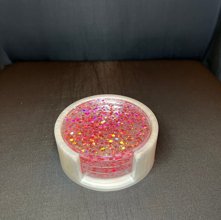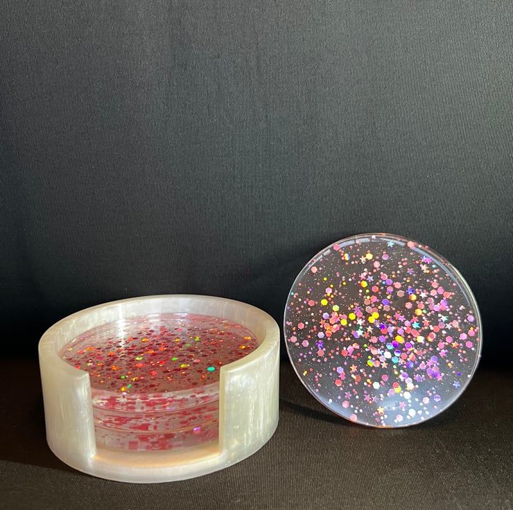 Coasters are clear with pink iridescent glitter which comprises of fine,chunky and stars, they are approximately 86mm in diameter and the holder is pearl white Mica powder, giving it a shimmery effect.